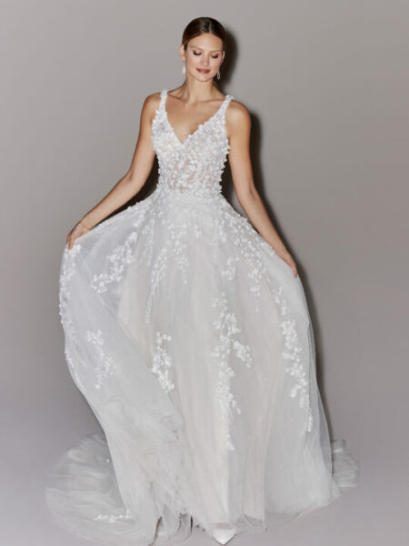 Sarover’s journey with the Justin Alexander Signature Nirvana gown began with her wish for a luxury A-line dress adorned with lace and 3D floral detailing. After exploring different options, she was drawn to Nirvana for its architectural bodice, fluid skirt, and intricate embellishment, which combined structure with romance. At her fitting, Marie and Caroline worked carefully to refine the fit and highlight the gown’s couture detailing, ensuring that every lace and 3D floral element enhanced the elegance of the design. The result was a gown that matched Sarover’s vision perfectly — dramatic yet timeless, and undeniably luxurious.