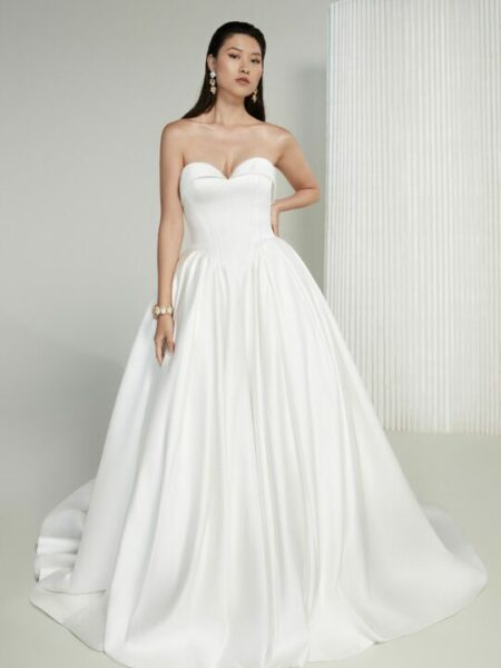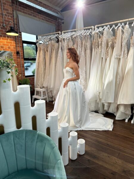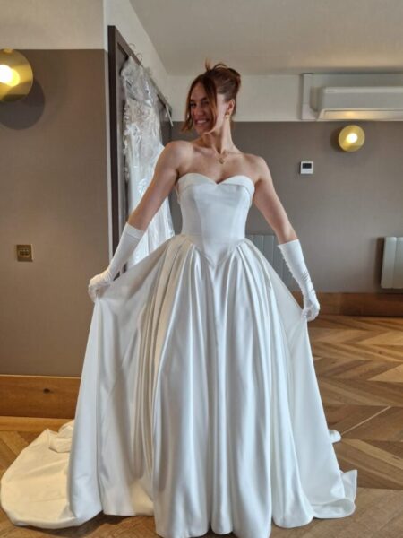 Netflix’s Love Is Blind UK Season 2 brought romance, drama, and some unforgettable bridal fashion moments. At Evelie Bridal, we were proud to play a central role in styling the brides. For filming, we transported over 150 gowns from our Maida Vale and South Kensington boutiques to the TV studio, temporarily closing our shops to make this possible. The brides were able to browse and select from the full collection, with final styling led by Caroline Black and the Evelie stylist team, and expert alteration support provided by Marie Martin of Reima Creations. Here’s a closer look at the four brides and the gowns they wore on screen: