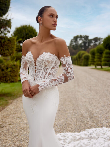 Sarover wore Nirvana, a standout from Justin Alexander Signature. With its architectural bodice, fluid skirt, and luxury detailing, Nirvana embodies modern couture craftsmanship blended with timeless romance. Styled by Caroline Black and the Evelie stylists, and fitted with the expert help of Marie Martin, the gown highlighted Sarover’s grace and presence at the altar.
