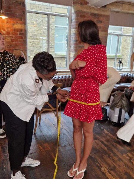 Sarover getting her measurements taken, during her fitting and waiting for her moment to reveal the dress.
