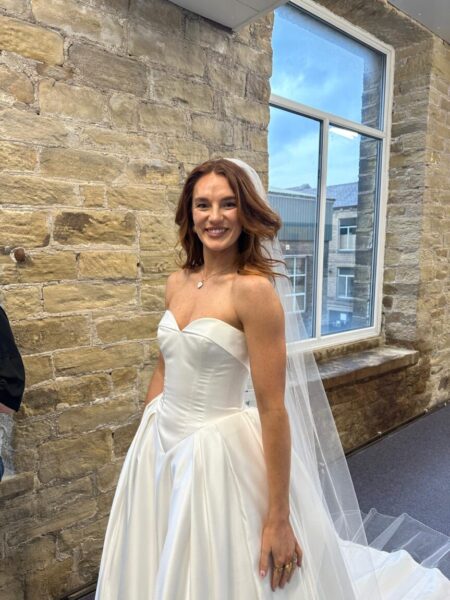 Our journey with Megan began with a touch of uncertainty, as she wasn’t sure whether she wanted a lace gown or something more sleek and plain. During her fitting, she explored a variety of styles before discovering how beautifully the basque waistline of the Justin Alexander Signature Joan gown flattered her figure. As Marie and Caroline worked carefully to pin and refine the dress, Megan’s hesitation transformed into delight. The moment she stood in front of the mirror, seeing the gown take shape, her expression lit up — the structured silhouette and dramatic train were everything she hadn’t realised she wanted, and Joan became the dress she truly loved.