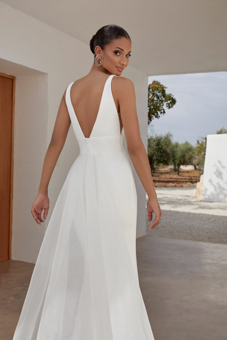 Alba is a stretch crepe fit and flare dress featuring V-neckline and V-back accented with inset waistband and detailed with V-side cutouts. Finished with crepe covered buttons down back, jersey lining, and chapel length train. The dress is paired with detachable organza train, sold separately fror £120