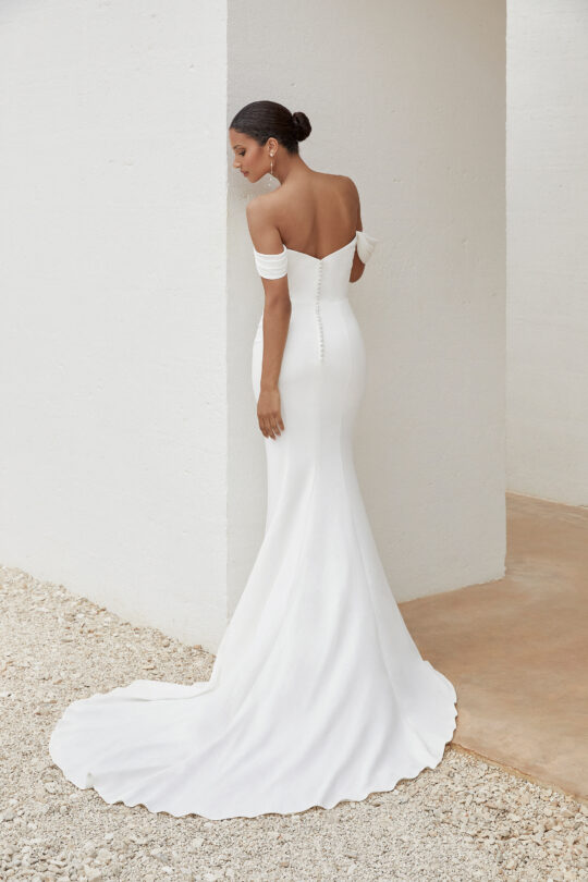 Annalina is a crepe fit and flare dress with pleated sweetheart neckline and detachable off the shoulder straps. V-cut back detailed with crepe covered buttons and a chapel length train.
