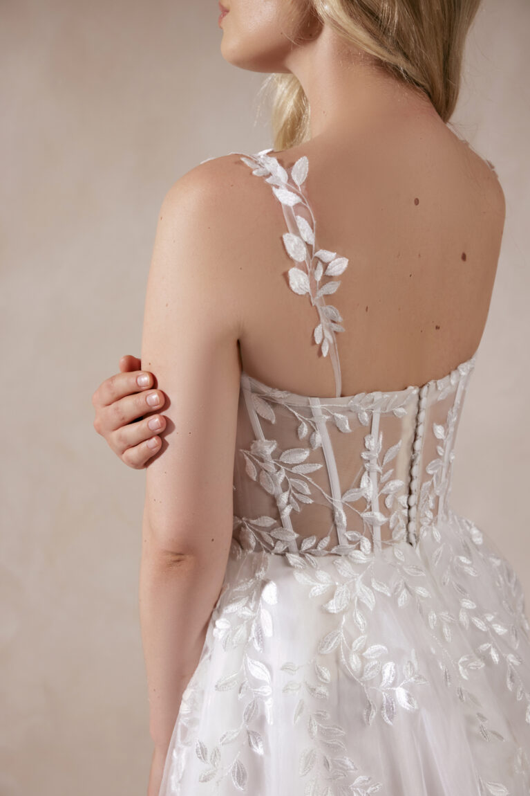 Seraphina is an ethereal tulle A-line gown featuring a romantic demi-cup sweetheart neckline and delicate detachable lace straps. Intricate matte lace embroidery adorns the bodice and straps, trailing gracefully onto the skirt for a cohesive, artisanal finish. The illusion bodice artfully reveals exposed boning for a touch of modern structure. Finished with elegant buttons extending from the back neckline to the waist, paired with a discreet invisible zip in the skirt. Complete with a sweeping chapel-length train. Also available with fully lined bodice.