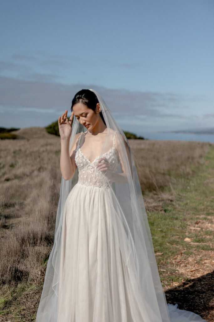 Adore Ondine. This chic clean stretch crepe A-Line gown offers a modern take on classic elegance. The bodice is beautifully designed with a flattering scalloped cuff neckline. The flowing skirt features a daring yet tasteful side slit, revealing a hint of leg as you walk. The gown is flawlessly finished with a line of buttons extending to the end of the majestic chapel-length train. A version without the skirt slit is also available.