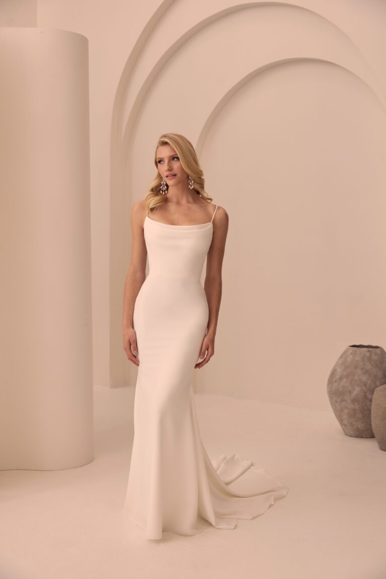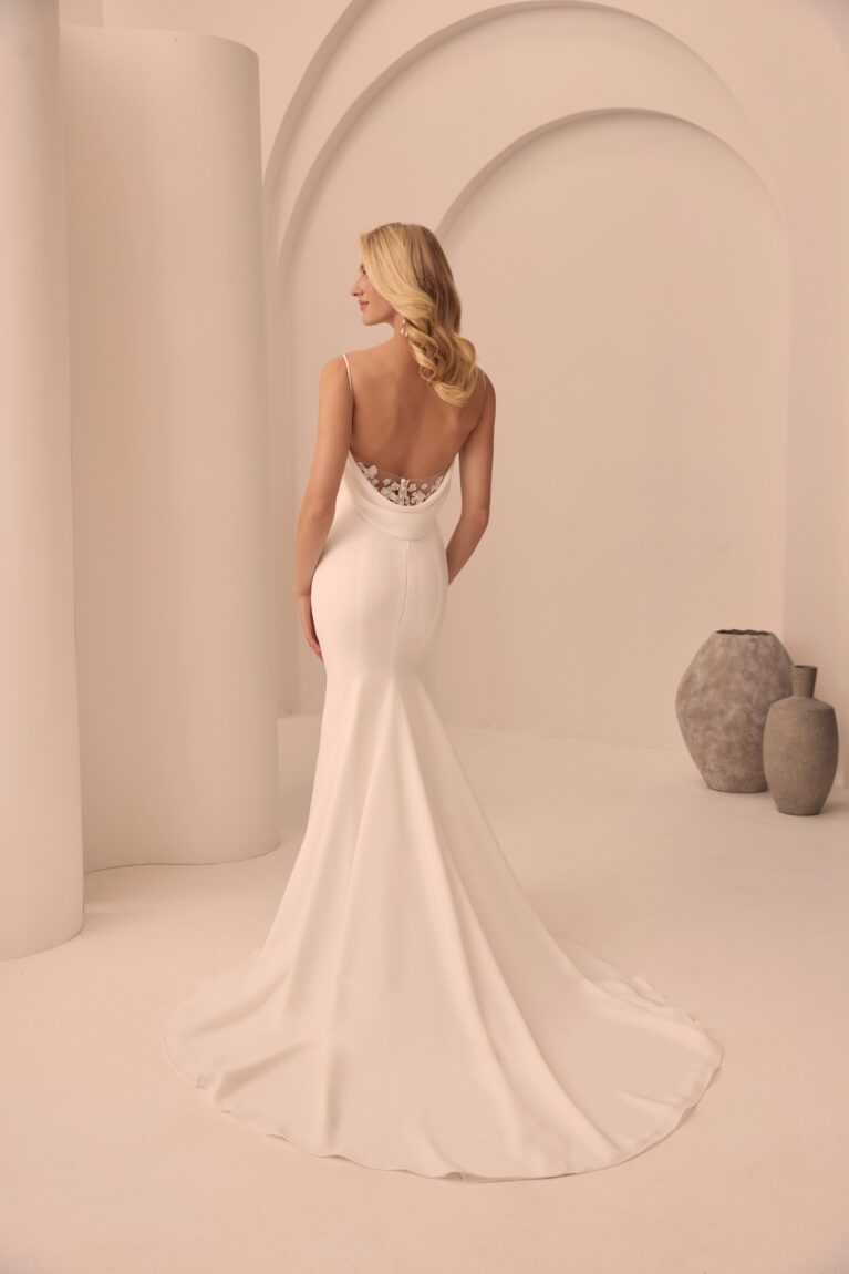 Style 2511 is a Crepe gown with a sleek bodice with a draped cowl neckline and delicate spaghetti straps, while the Italian Tulle back showcases intricate 3D Crepe flowers. This modern classic comes complete with a detachable draped cowl at the back, making it perfect for brides seeking two looks in one. Finishing off the look, fabric-covered buttons cascade down the center back to the waist, leading to a fit and flare Crepe skirt.
