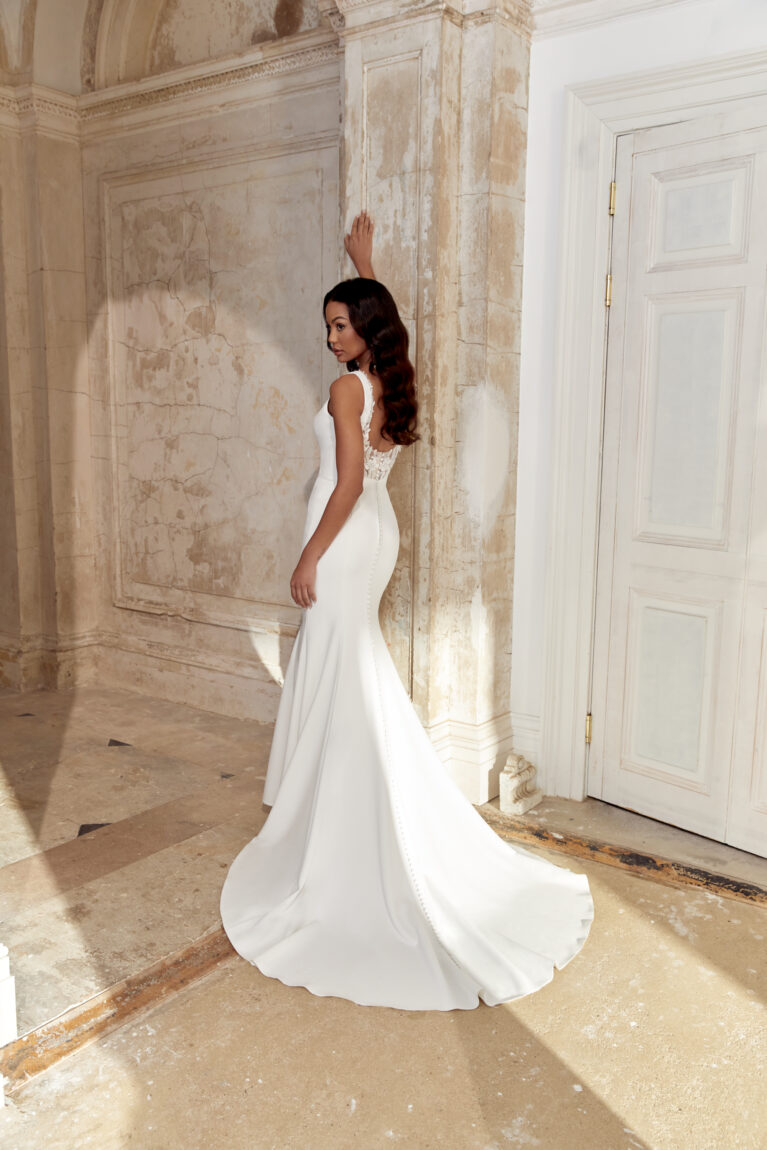This clean stretch crepe fit-and-flare gown features a square neckline for a polished look. Inverted pleating in the skirt adds graceful movement, while the illusion scoop back shines with beaded and sequined lace appliqués accented by pearls. Buttons trail to the end of the invisible zipper, flowing into a chapel-length train—perfect for brides embracing modern elegance with subtle sparkle.