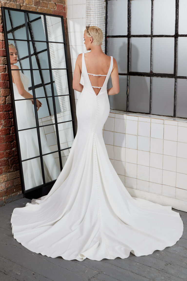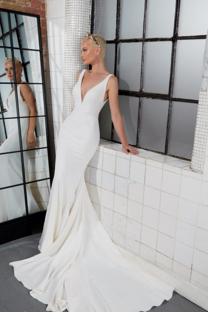 The Blake gown embodies effortless sophistication for the modern bride, with its luxurious crepe fabric forming a figure-flattering fishtail silhouette that gracefully hugs and highlights your natural curves. The deep plunge neckline, delicately trimmed with shimmering pearls, adds a touch of refined glamour, while the clean lines offer versatility—pair it with optional coordinating sleeves for a customized look or keep it sleek and simple for timeless chic.