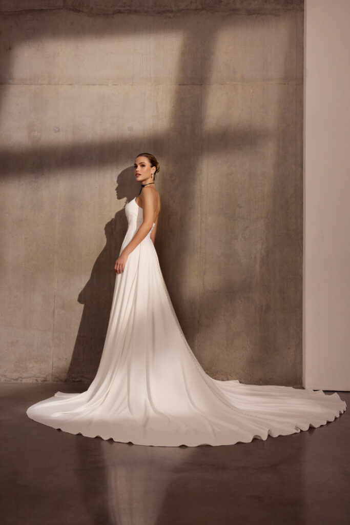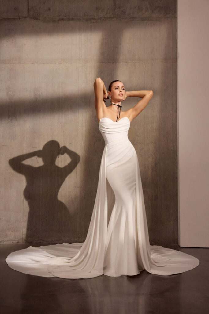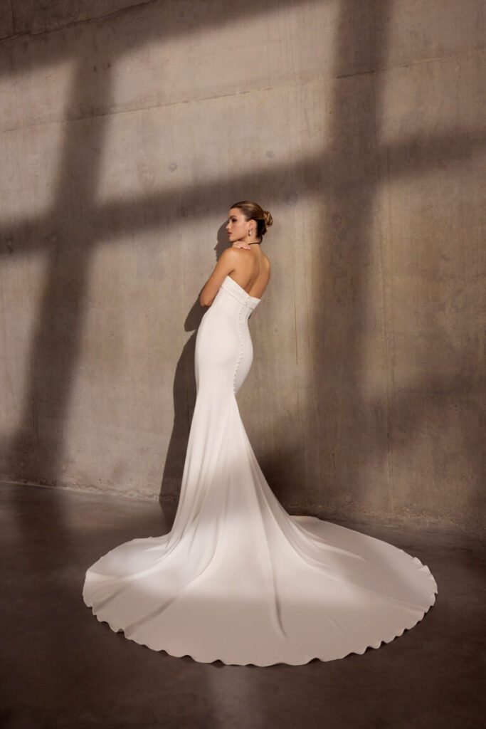 Cleo is a figure-flattering strapless gown made with luxury georgette crepe fabric that drapes elegantly across the body, creating an irresistible silhouette. The exquisite corseted basque waistline provides subtle structure while maintaining a feminine softness. Delicately finished with elegant covered buttons, Cleo exudes timeless sophistication and refined detail. This versatile design allows brides to personalize their look with optional sleeves, ensuring each wedding gown reflects individual style and vision. An optional overskirt is also exclusively available at Evelie South Kensington for an additional £800.