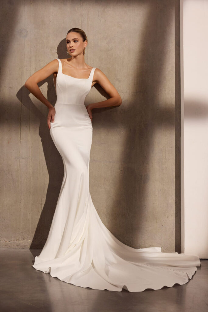 Experience the elegance of Nicola, a timeless and effortless chic silhouette in luxurious Japanese satin crepe. The flattering tailored cut enhances feminine curves, complemented by a sophisticated square neckline. Featuring exquisite covered button details and a stylish train, Nicola epitomizes grace and refinement for your unforgettable moments.