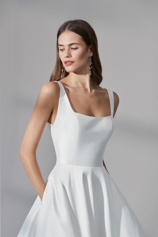 Justin Alexander Signature Charleston is a chic stretch Mikado ball gown. It features a flattering square neckline and a square back. The natural waistline leads to a full skirt with pockets and is detailed with a bias band hem. Mikado covered buttons are positioned on the back all the way down to the end of the chapel length train.