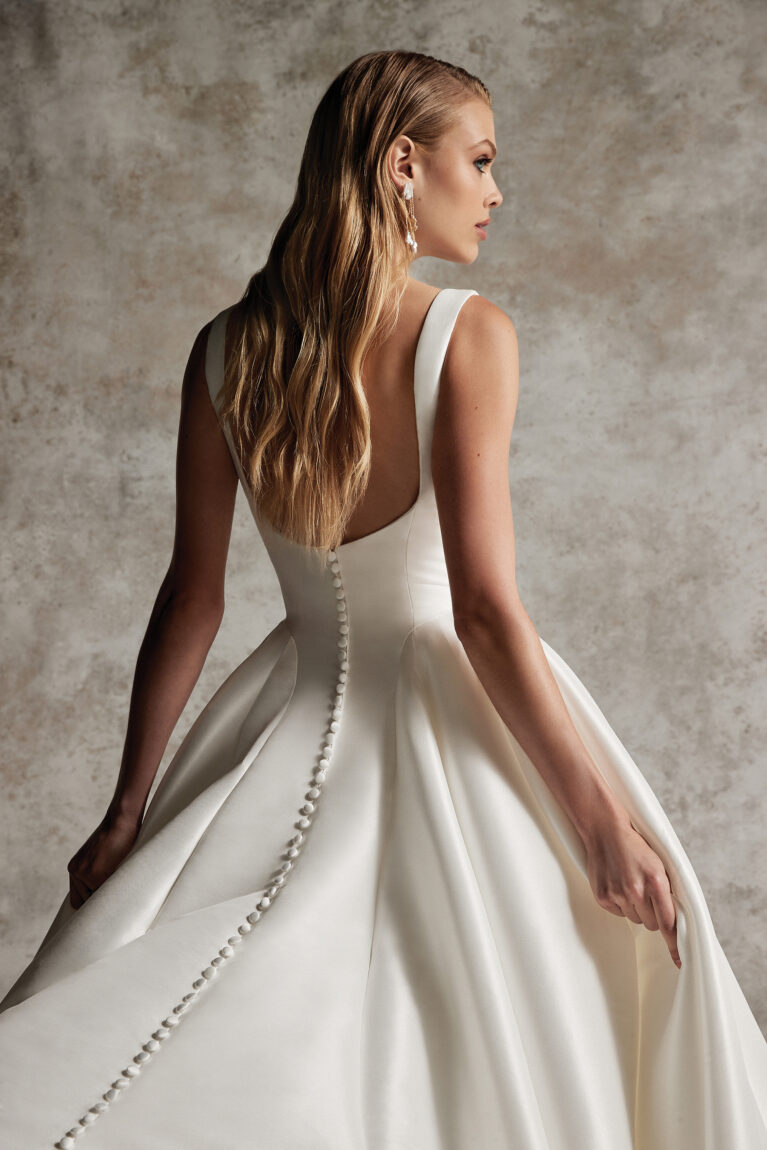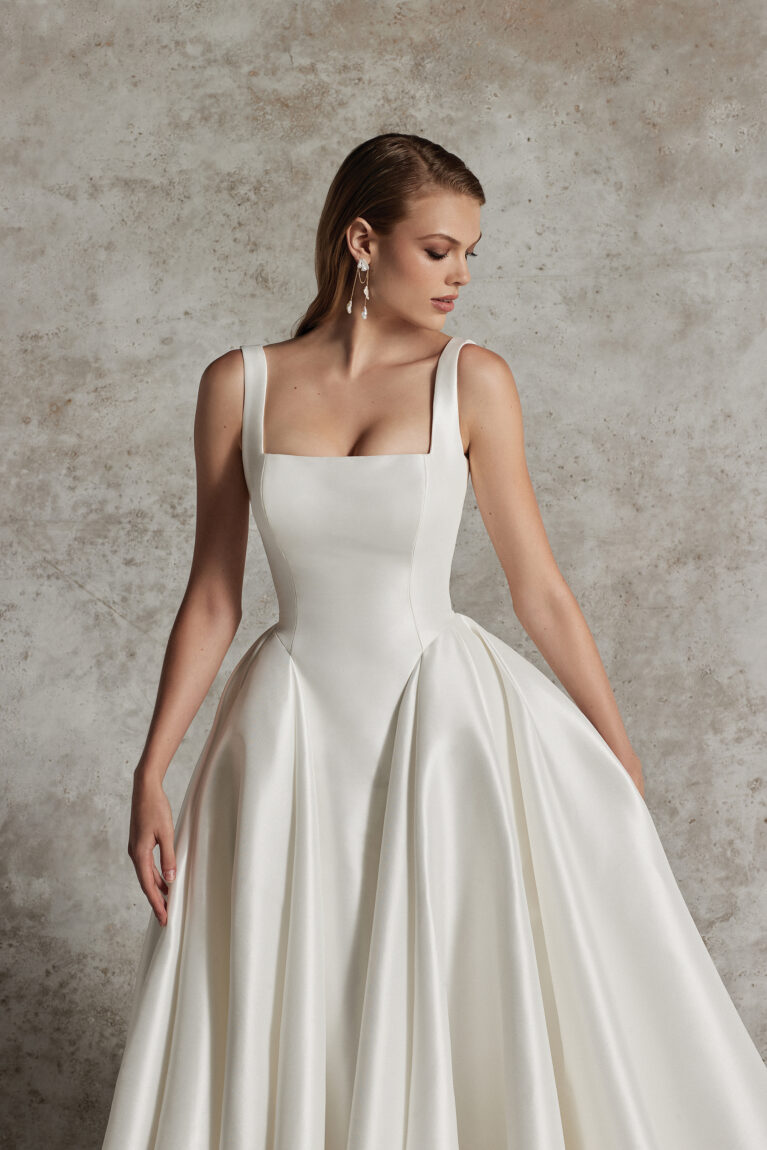 Dabira is a stretch Mikado ball gown with a square neckline and scoop back. The dress features a full skirt with couture seaming, box pleats at the hips, pockets and Mikado covered buttons extending to end of chapel length train. Also available with detachable sleeves.