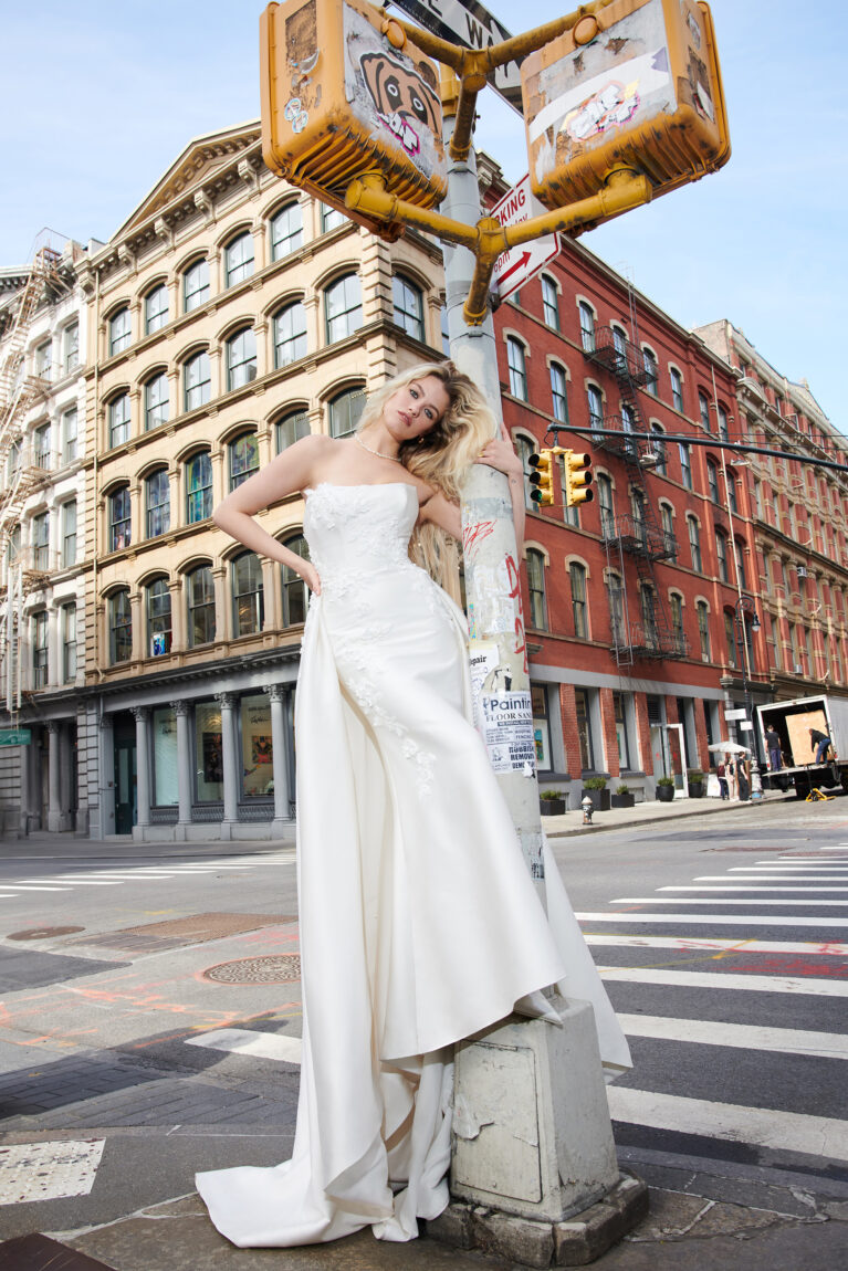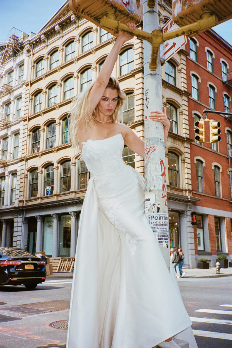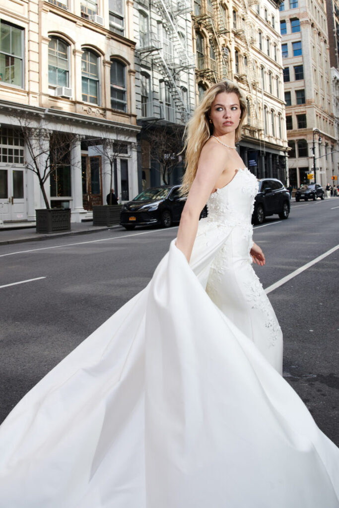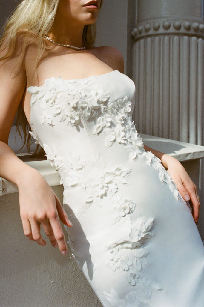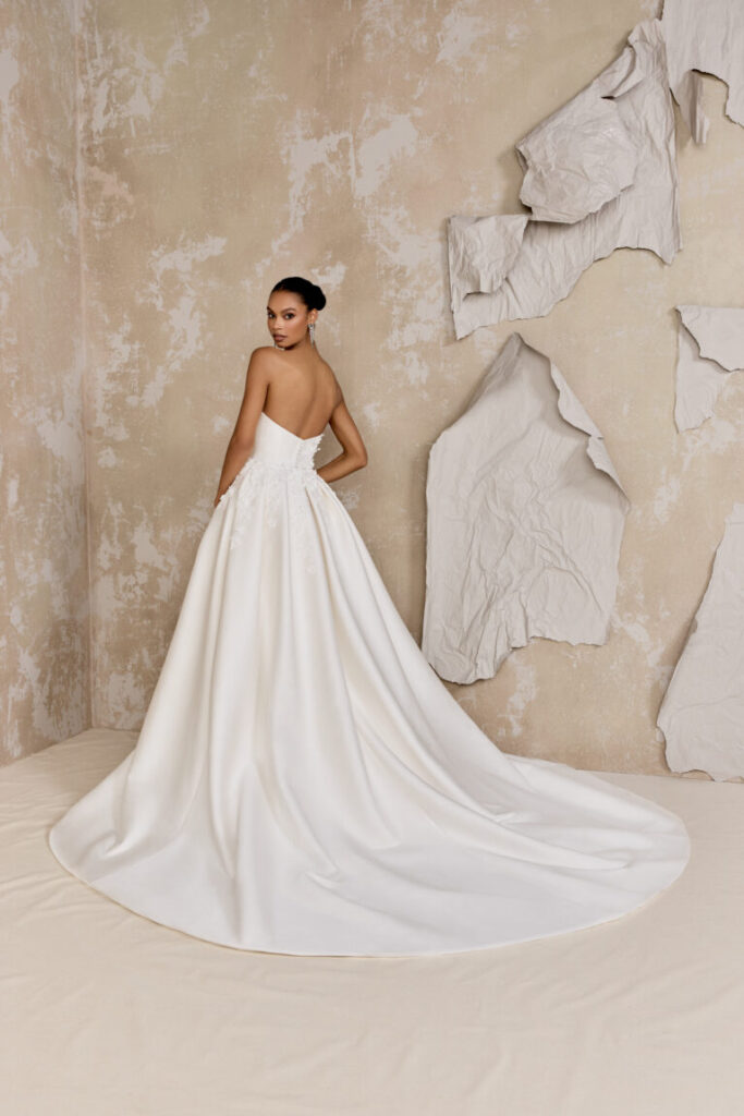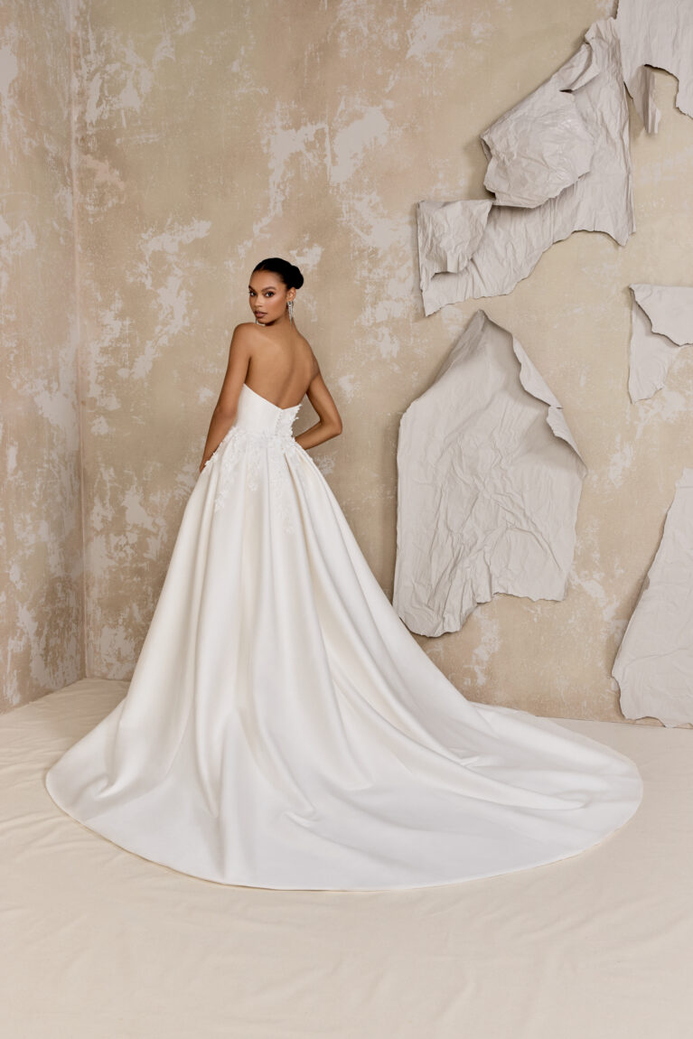 Dickinson is a fit-and-flare dress crafted from stretch Mikado featuring a flattering strapless scoop neckline and meticulously tailored princess seams that sculpt the bodice and skirt. Delicate lace embroidery, beginning at the neckline, cascades across the front and back, creating a breathtaking visual. 3-D laser-cut crepe floral appliqués, embellished with clear beads and crystals, are layered over the embroidery, adding exquisite dimension and sparkle. Finished with a classic button closure to the end of the zipper, this gown culminates in a graceful chapel-length train. A matching detachable train is available separately for £1100.