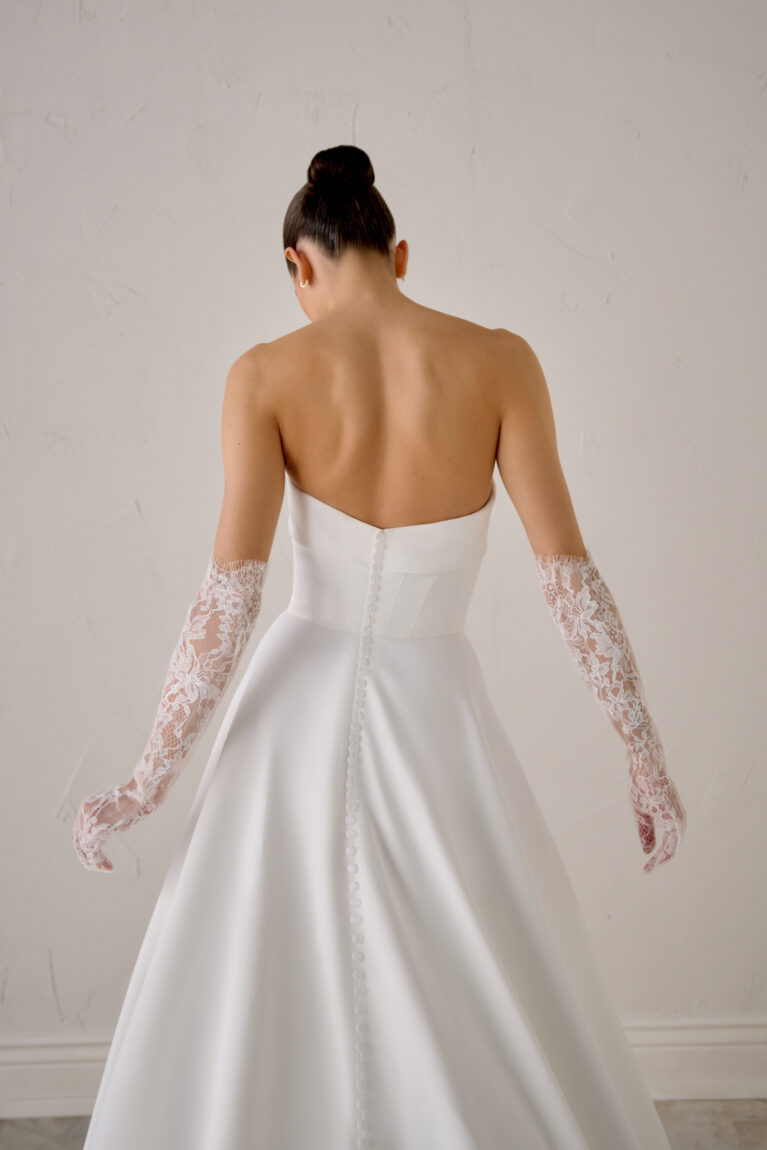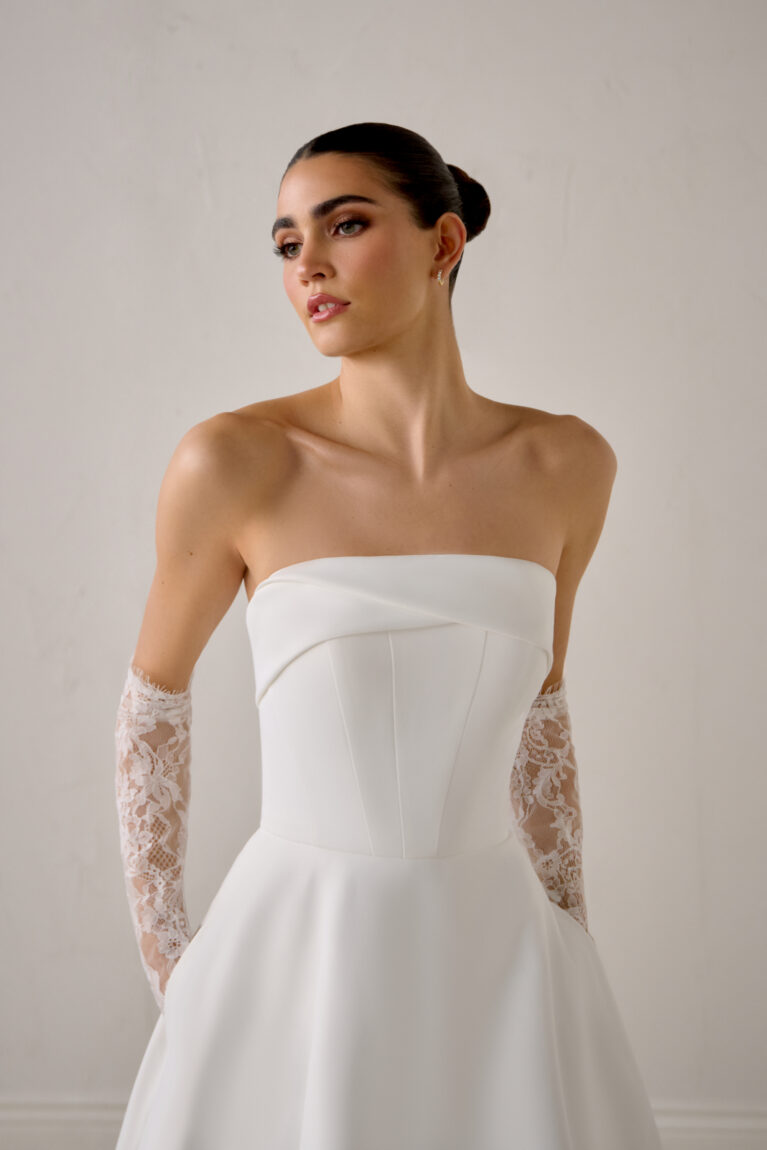 Justin Alexander Signature Empressa. A chic A-Line gown crafted from luxurious clean matte satin. The bodice is cinched by a distinctive strapless asymmetrical cuff neckline and enhanced with artistic modern seaming. Designed with the contemporary bride in mind, this dress features practical pockets and is completed by a line of elegant buttons that trail down the back of the chapel-length train.