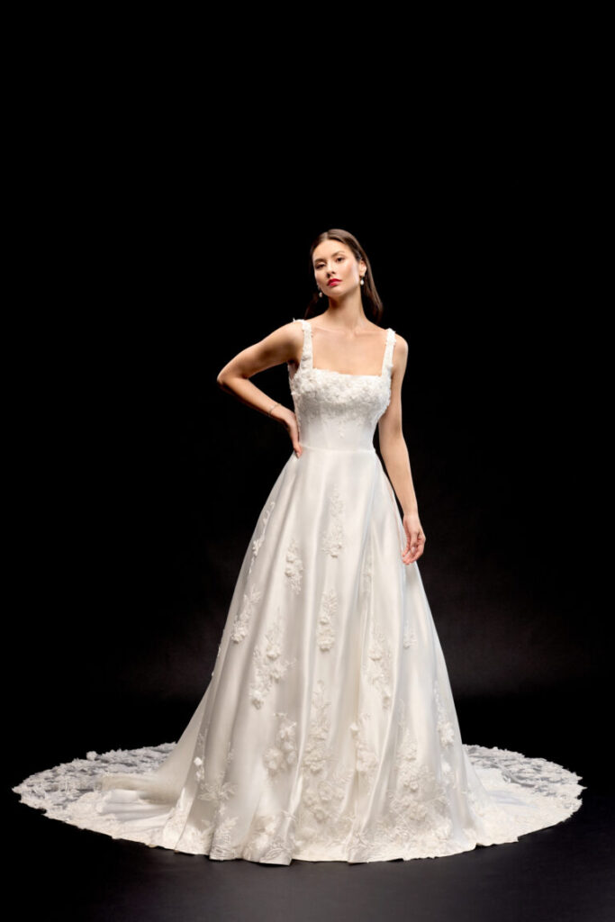 Evangeline is a luminous satin A-line gown adorned with tonal beaded and sequined lace appliqués. Delicate 3-D chiffon floral details are scattered throughout the gown for romantic dimension. The bodice features an elegant square neckline with a scoop back neckline and flattering princess seams for a sculpted fit. The full A-line skirt includes convenient pockets and a statement cut-out train detailed with lace for a dramatic exit. Complete with matching satin buttons extending to the end of the cathedral-length train.