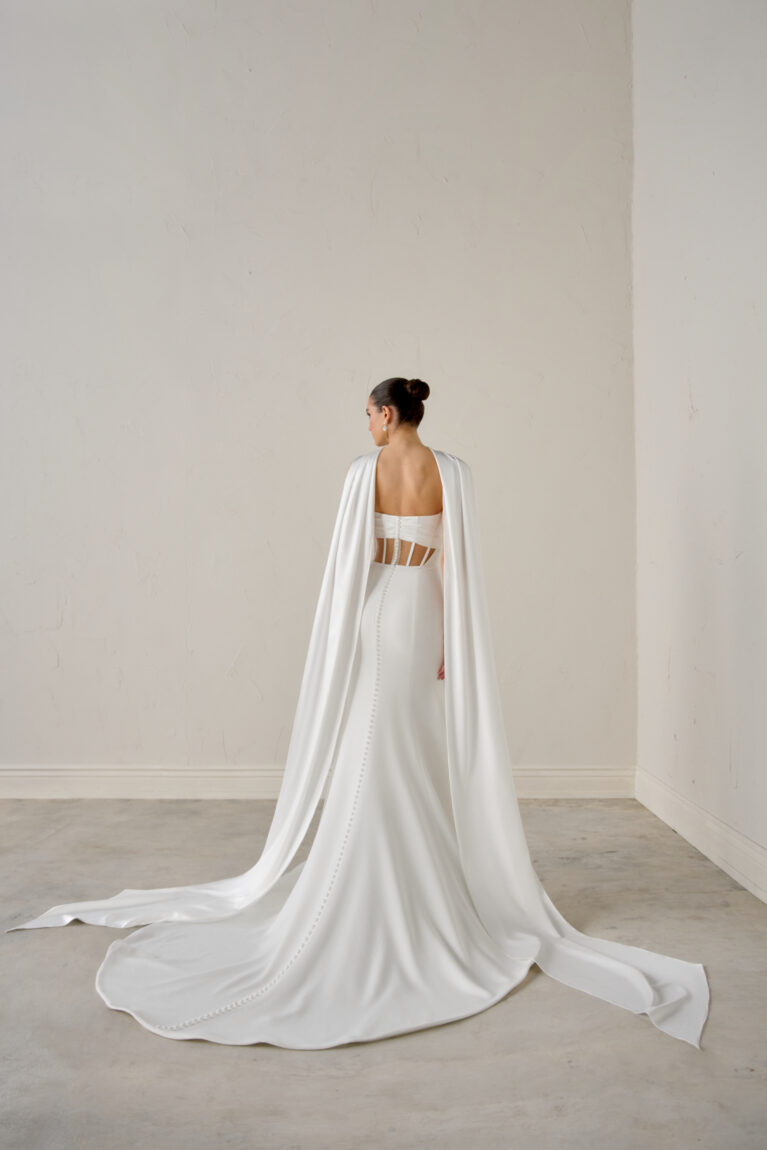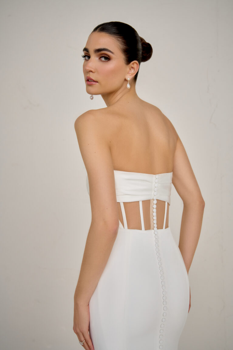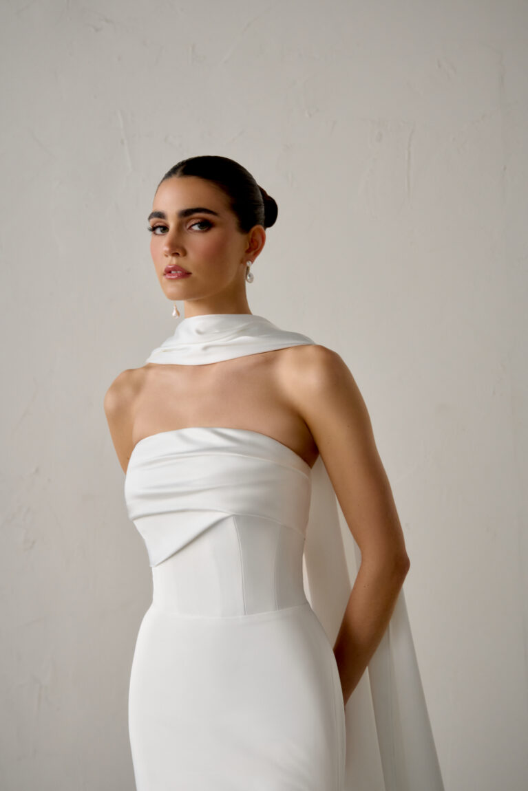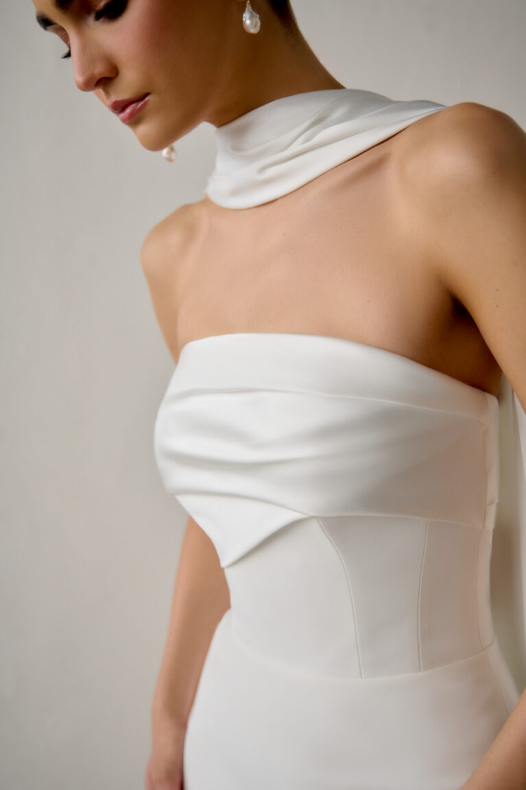 Justin Alexander Lyric. This striking fit-and-flare gown in smooth stretch crepe is defined by its meticulous draping. A band of luxurious charmeuse drapes across the strapless straight neckline and wraps around the bodice in an asymmetrical design. This soft draping creates an enticing contrast with the exposed boning revealed beneath the charmeuse on the back bodice. Buttons trail down the back to complete the dramatic chapel-length train.