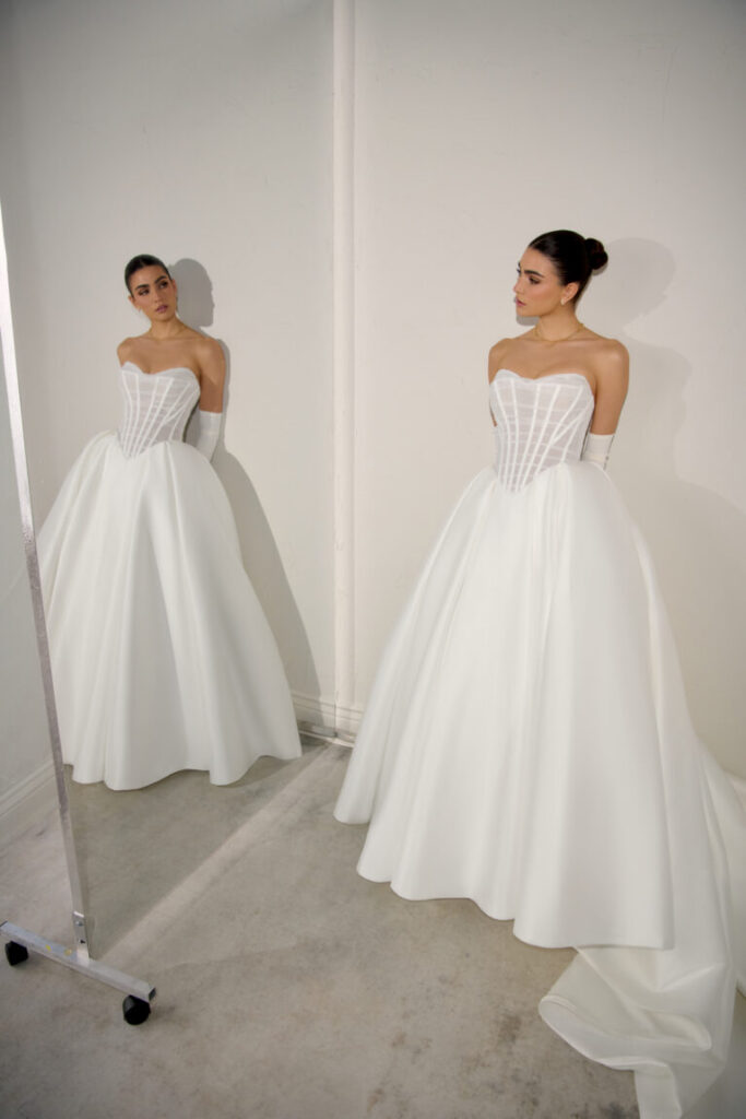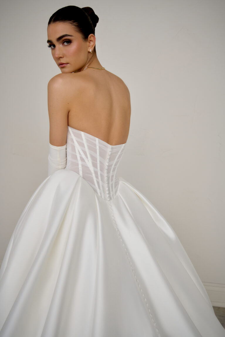 Justin Alexander Signature Monarch. A glamorous choice, this clean stretch Mikado ball gown features a bold, strapless pointed sweetheart neckline. The sheer bodice makes a dramatic statement, revealing exposed boning beneath transparent mesh draping, all emphasizing a striking Basque waistline. The voluminous stretch Mikado skirt features classic box pleating and includes convenient pockets. The look is flawlessly finished with a row of buttons extending all the way down the magnificent chapel-length train. Also available with a fully lined bodice.
