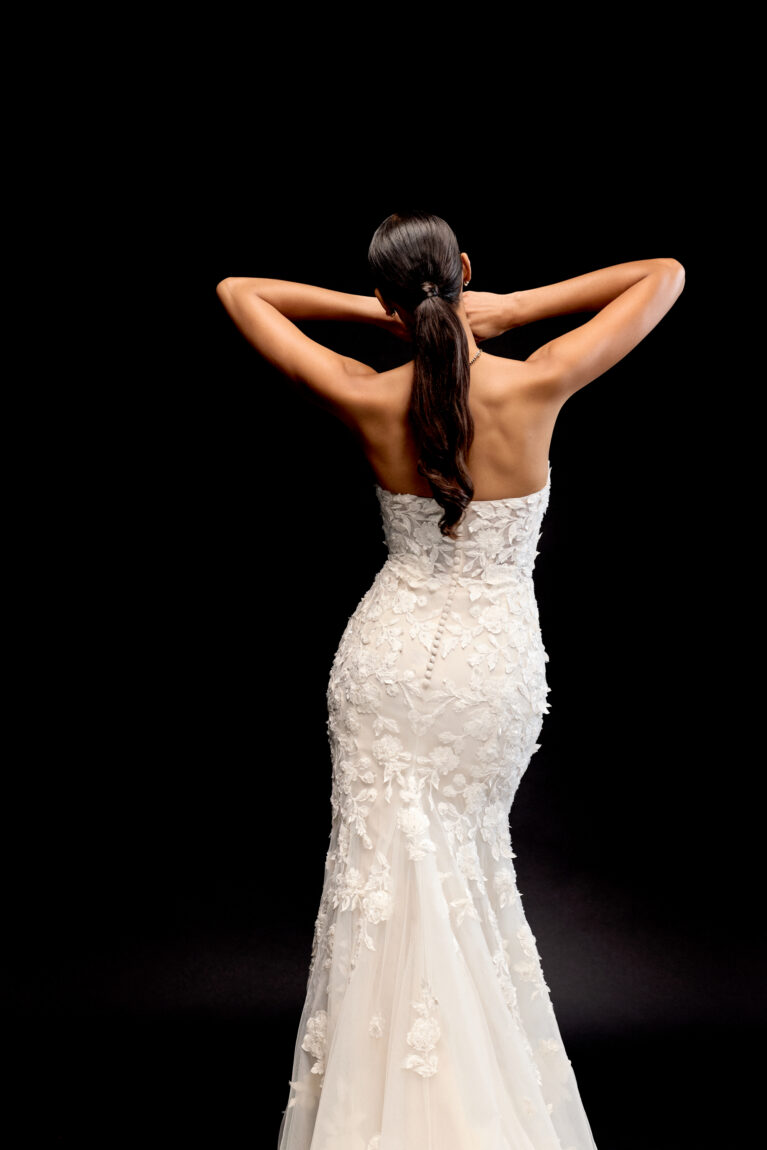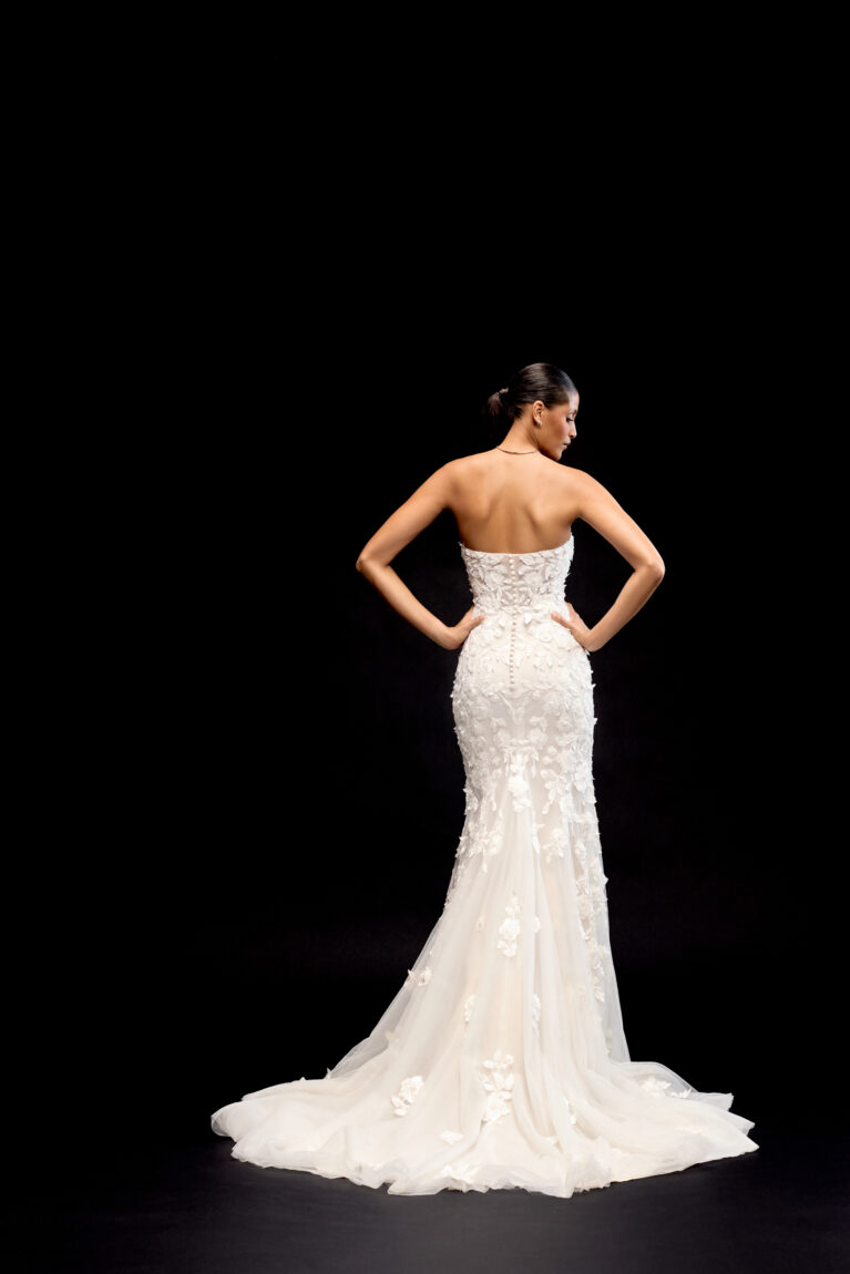 Nyx is a sculptural fit-and-flare lace gown featuring an illusion bodice with exposed boning elegantly wrapped in lining for architectural sophistication. The gown is lavishly covered in 3-D laser-cut satin lace appliqués, intricately embroidered with clear sequins, clear bugle beads, and luminous ivory pearls for dimensional shimmer. Matching tulle-covered buttons are placed over the zipper at center back, and the dress is complete with a sweeping chapel-length train.
