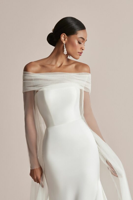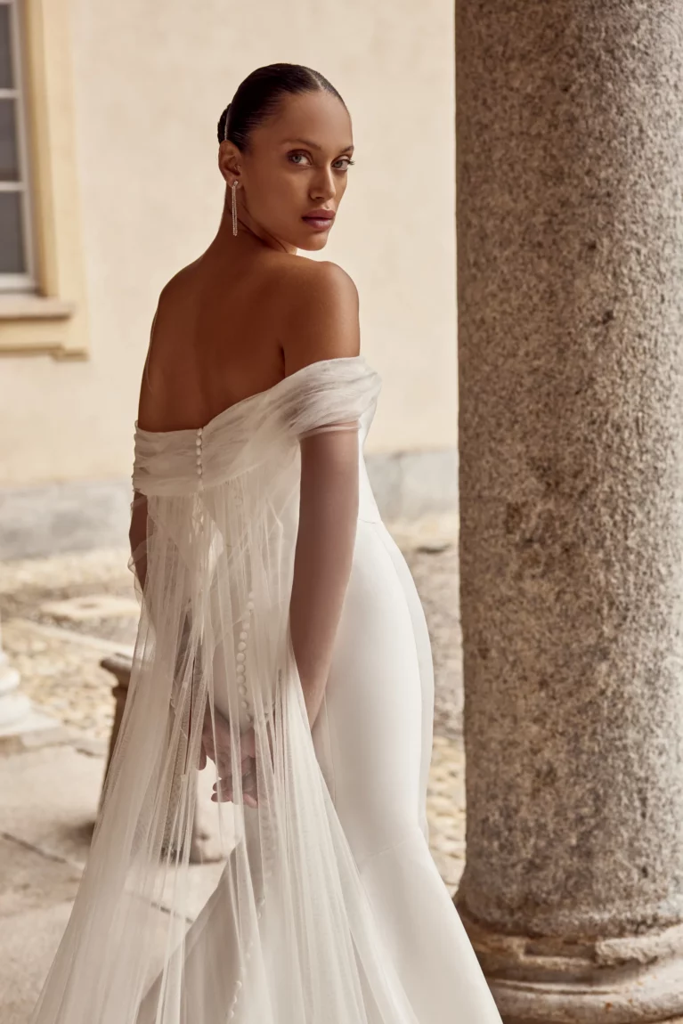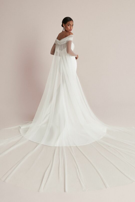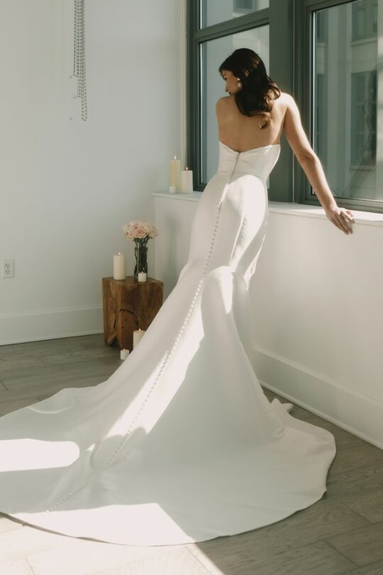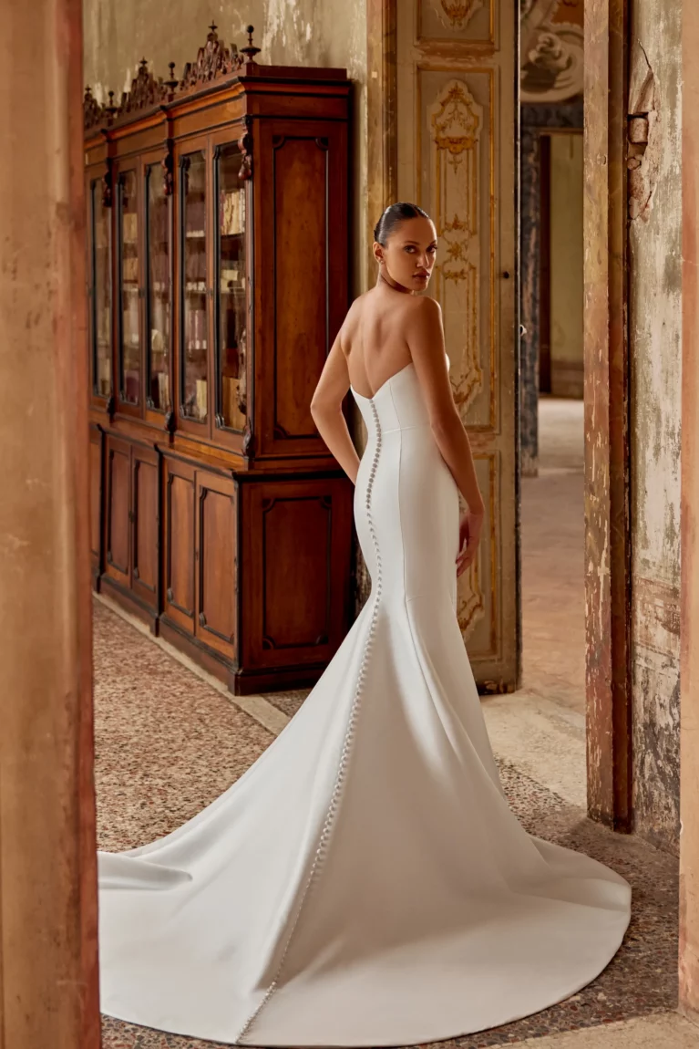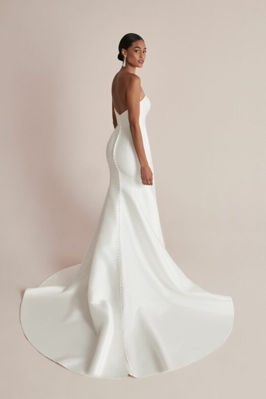 Celeste is a strapless stretch Mikado fit and flare gown with straight neckline and subtle V-back. It features princess seams down front bodice and down back and inverted godet at skirt sides. Finished with Mikado covered buttons to end of chapel length train. Paired with English net cape available separately for £350.