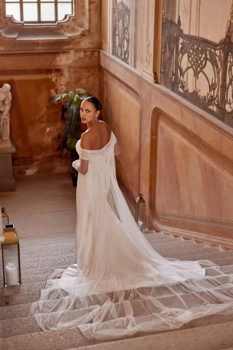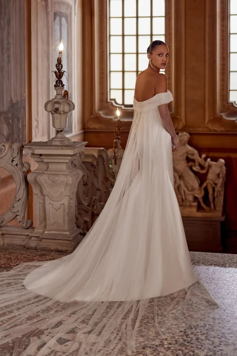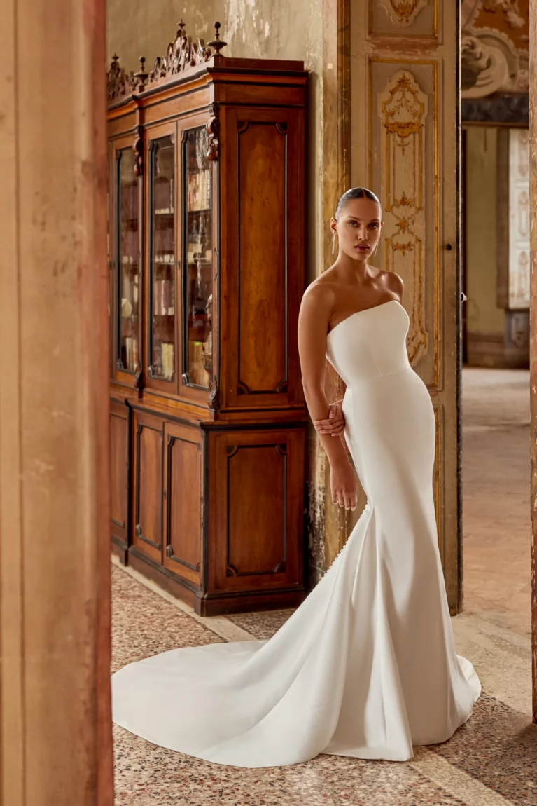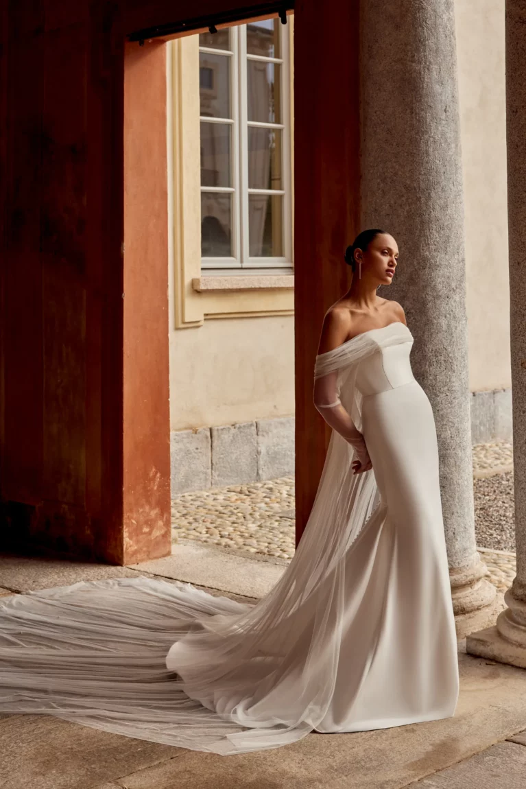 Celeste is a strapless stretch Mikado fit and flare gown with straight neckline and subtle V-back. It features princess seams down front bodice and down back and inverted godet at skirt sides. Finished with Mikado covered buttons to end of chapel length train. Paired with English net cape available separately for £350.