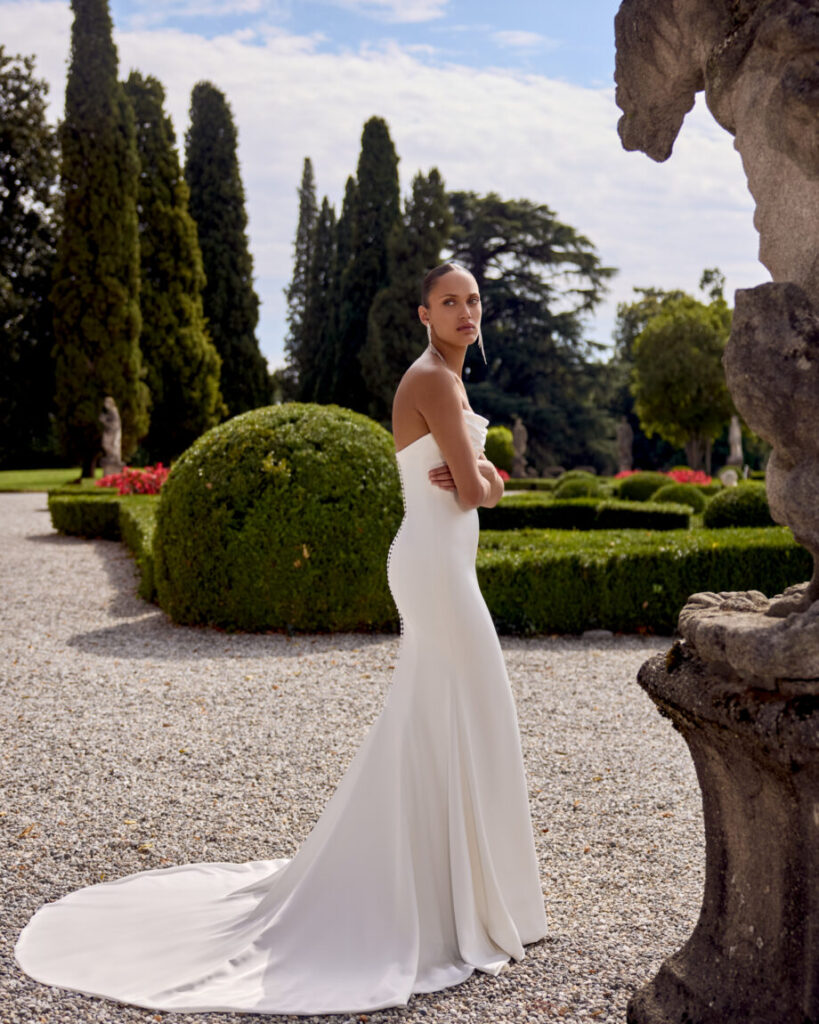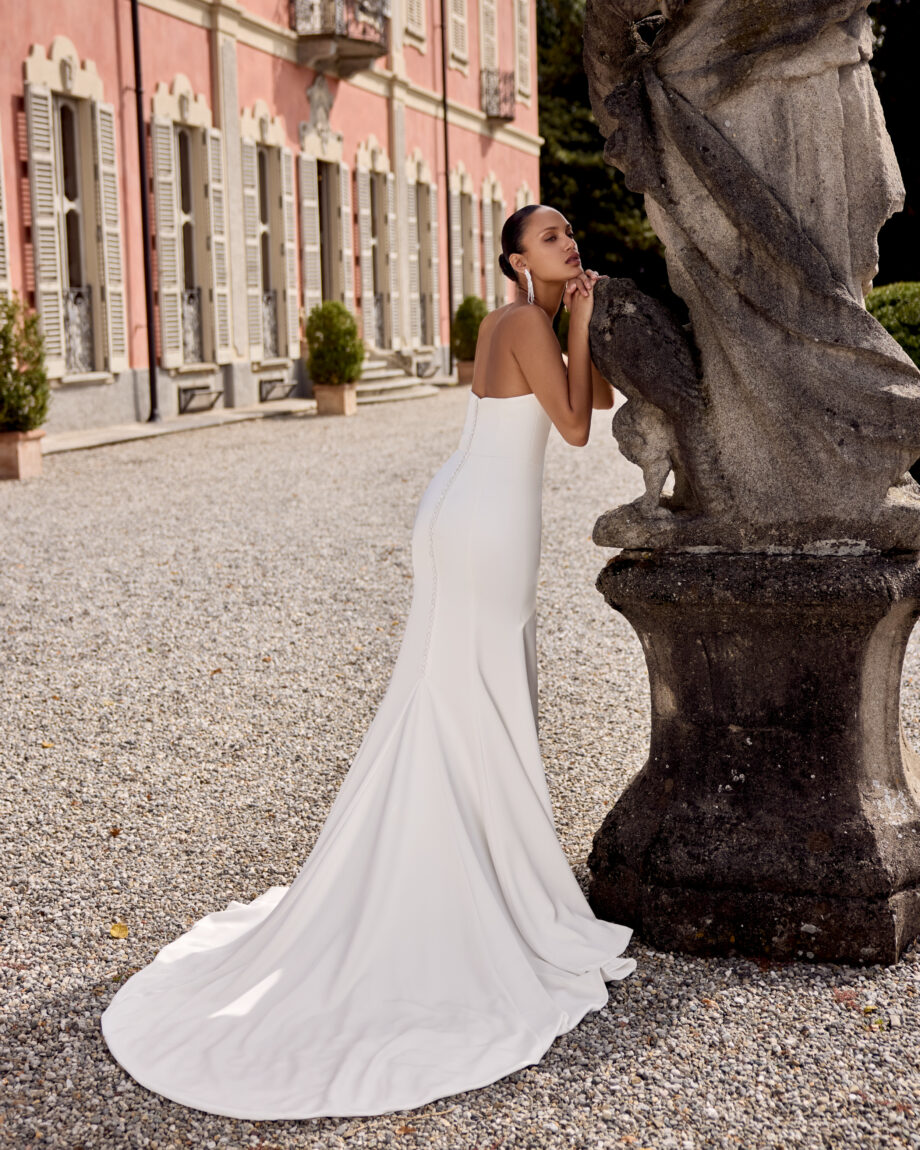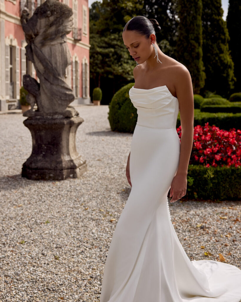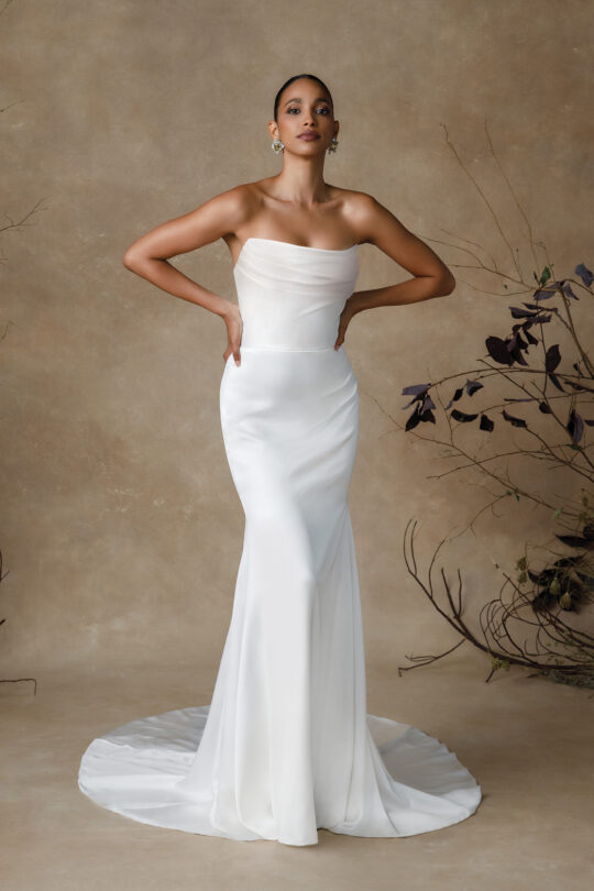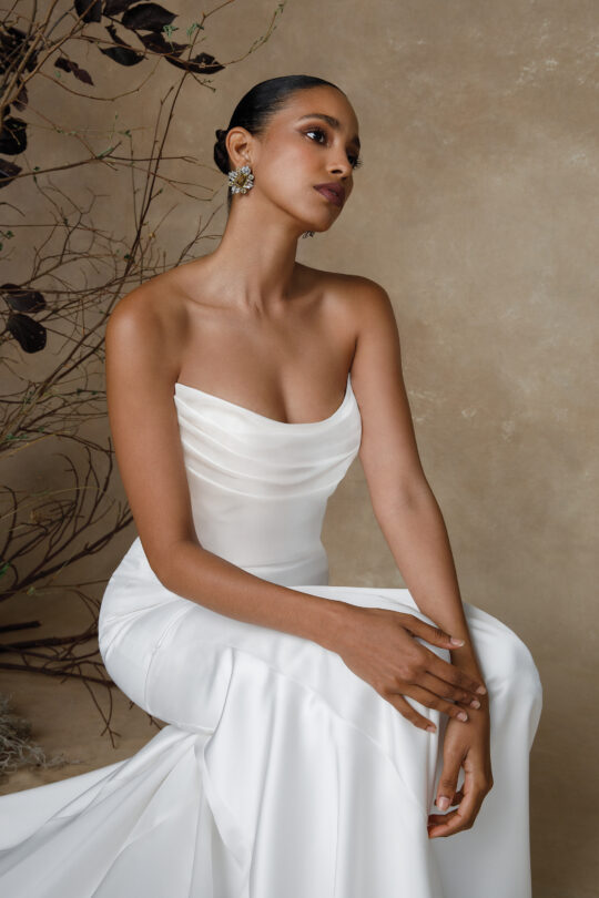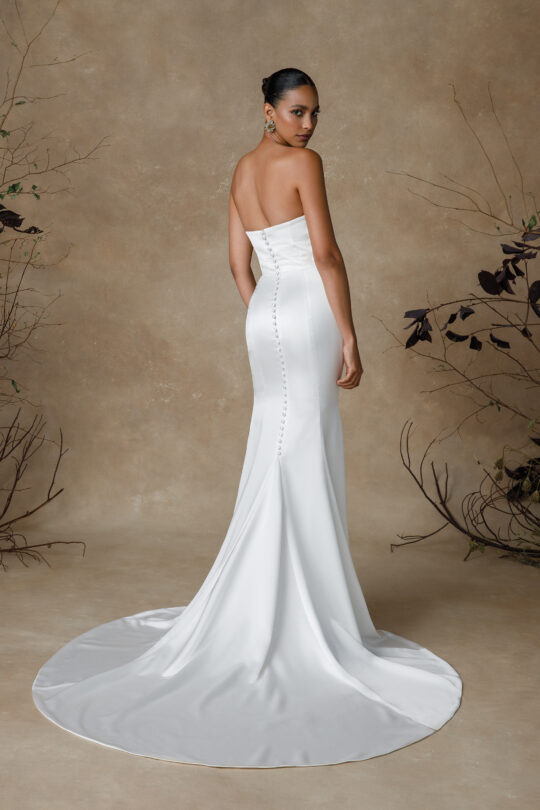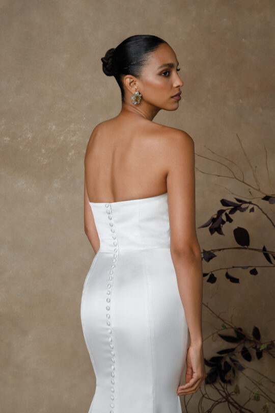 Gwinn is a strapless charmeuse fit and flare dress with draped scoop neckline. The dress is finished with charmeuse covered buttons extending down back to start of godet on chapel length train.