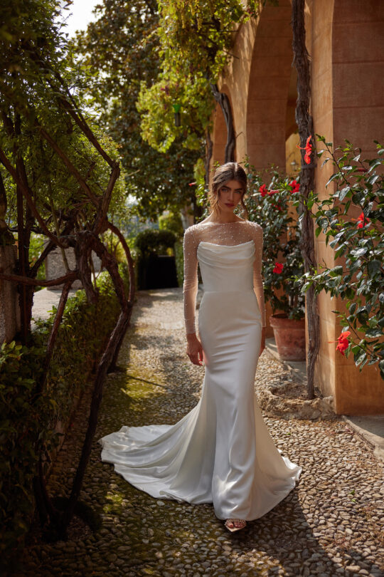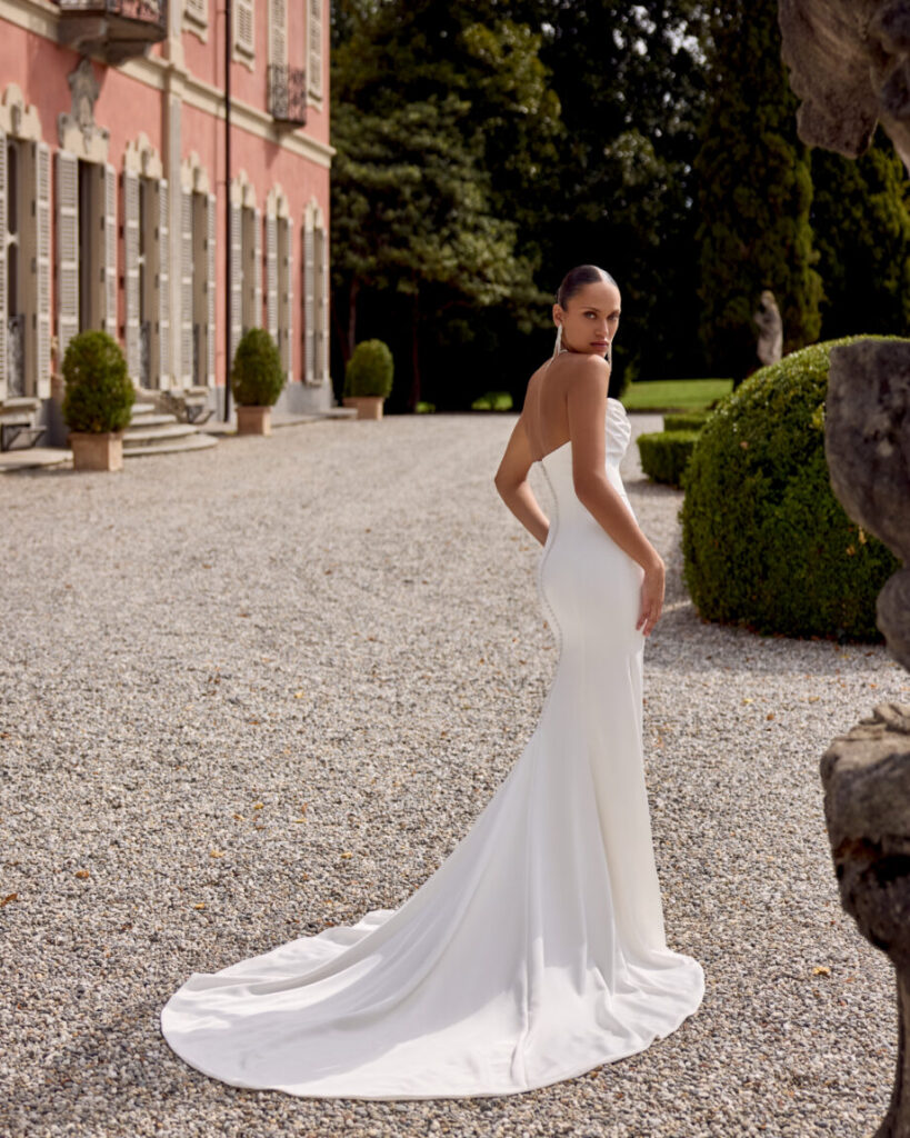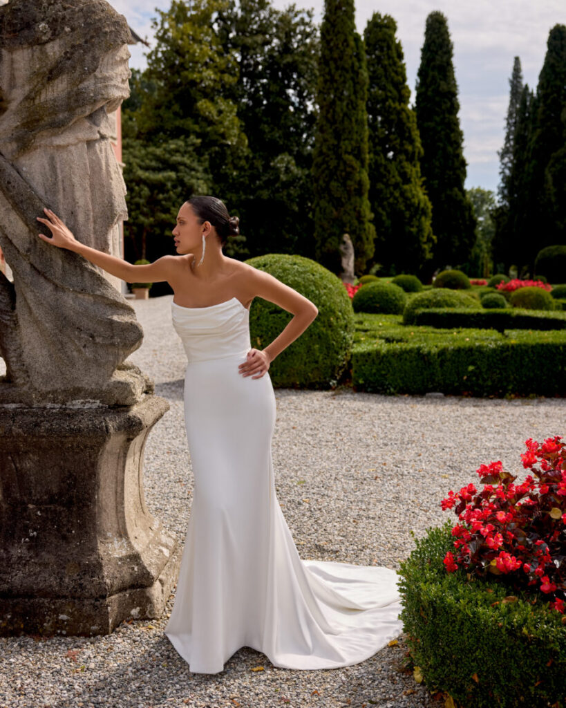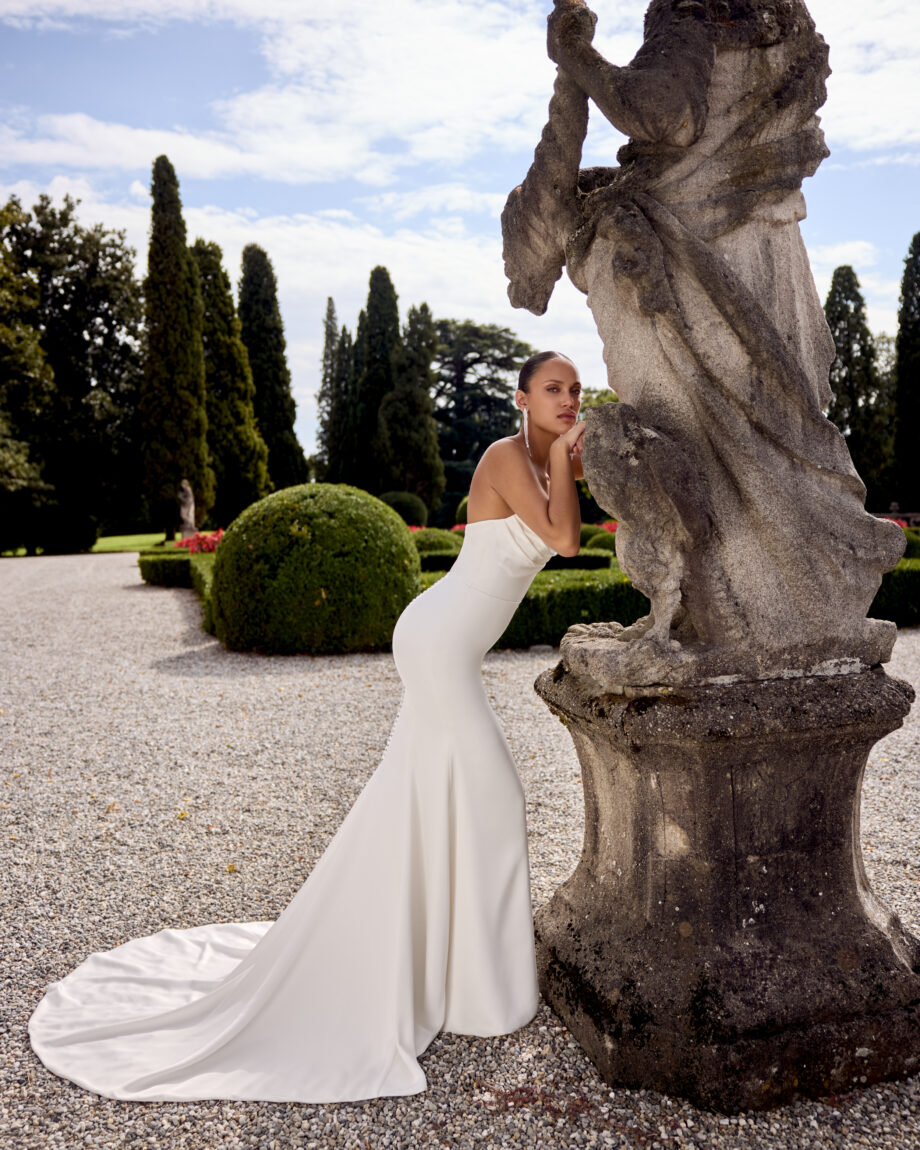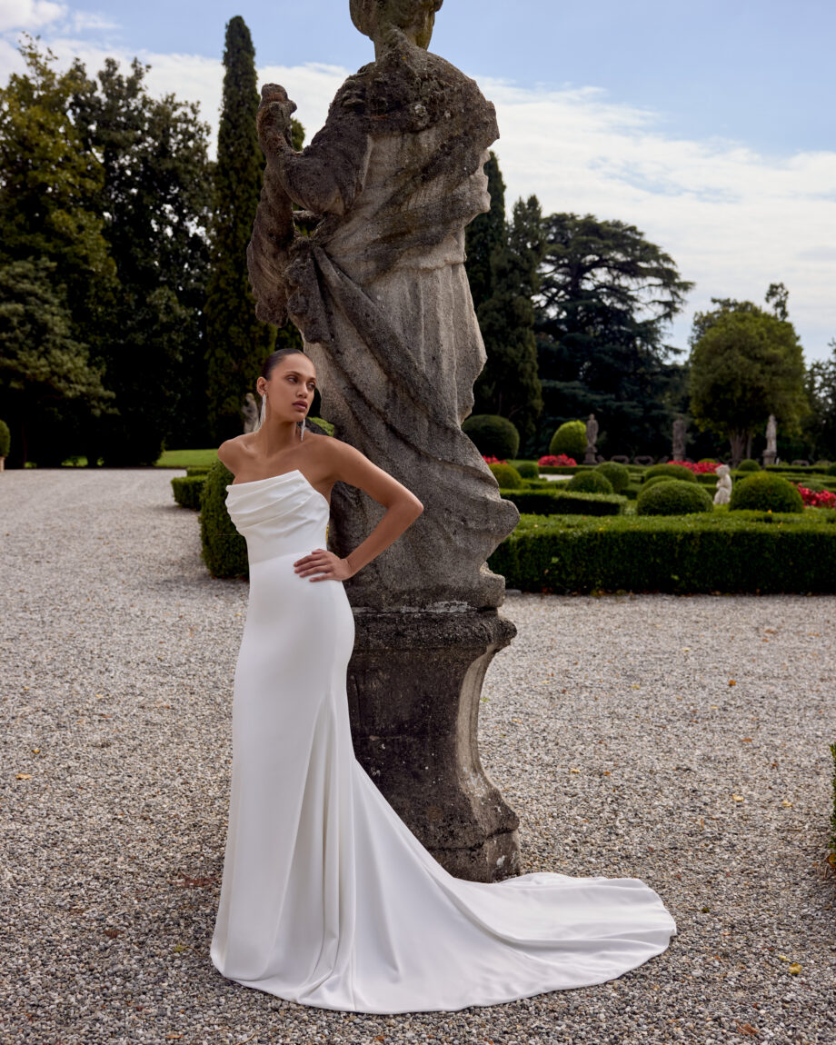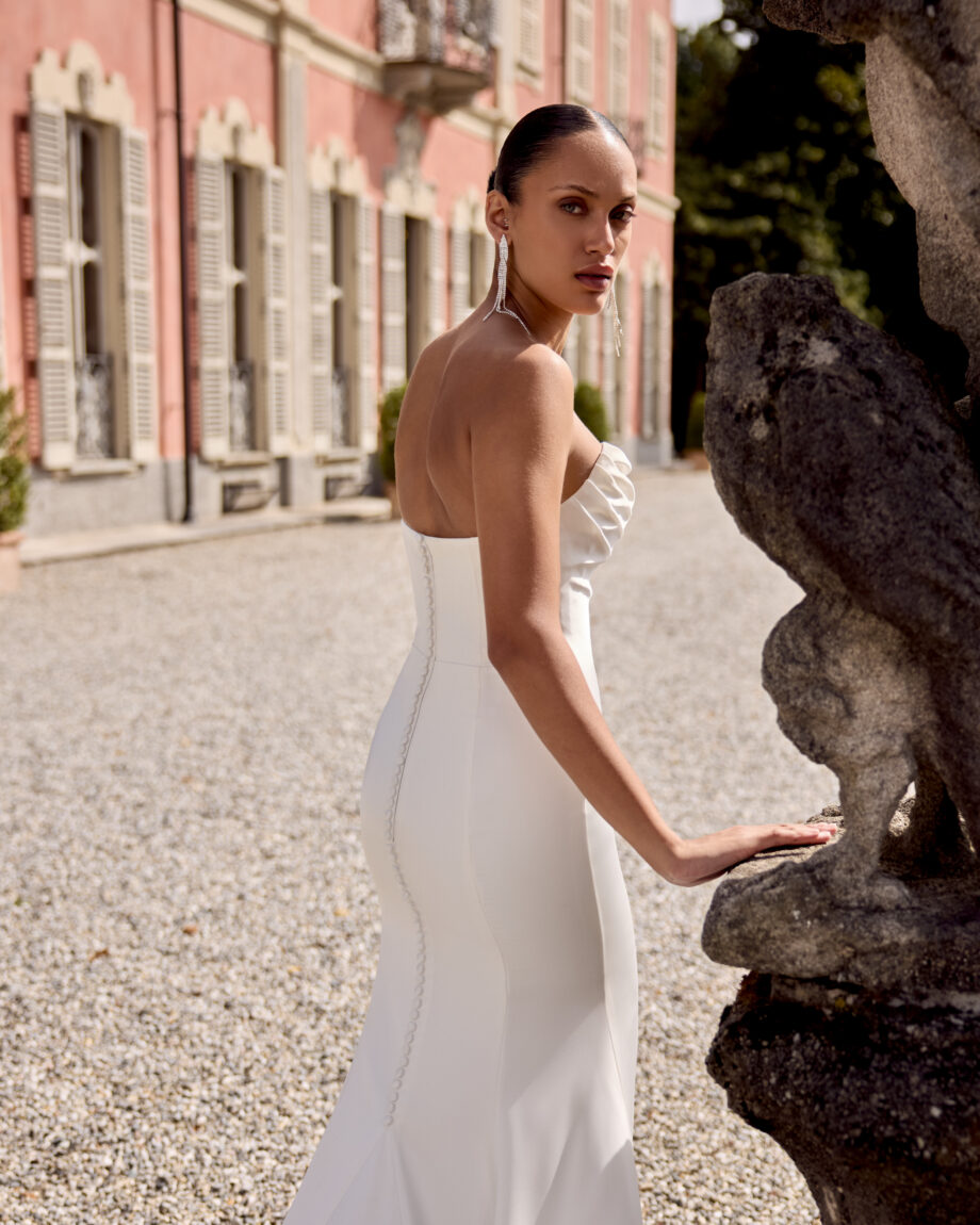 Gwinn is a strapless charmeuse fit and flare dress with draped scoop neckline. The dress is finished with charmeuse covered buttons extending down back to start of godet on chapel length train.