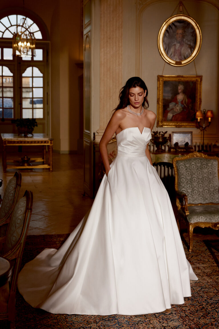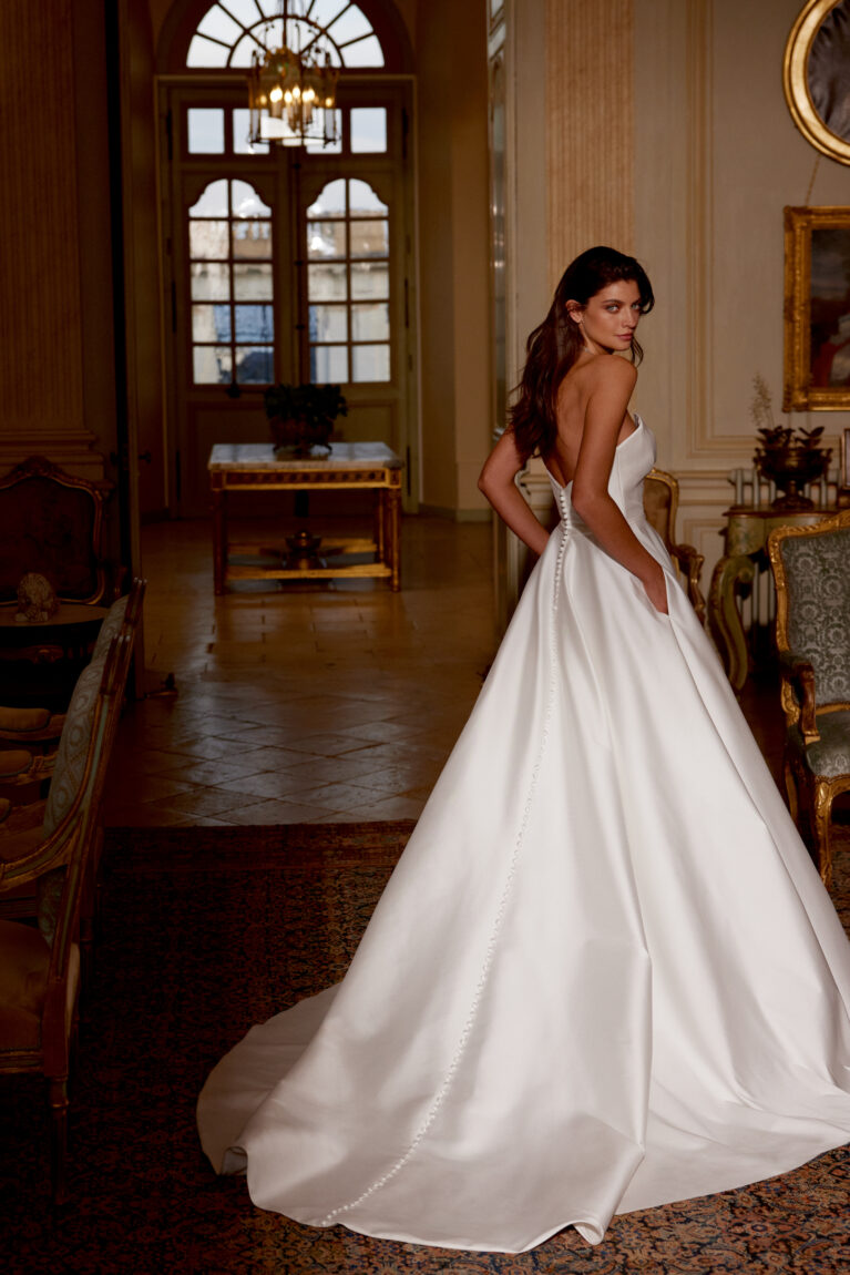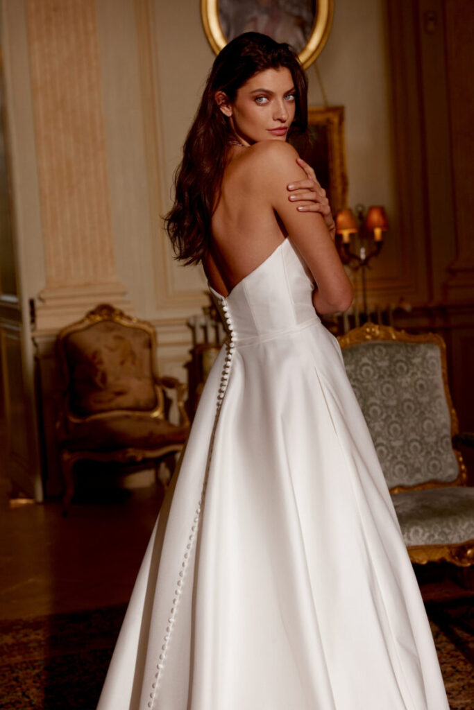 Jones is an allover clean stretch Mikado A-line gown with strapless notch neckline featuring cross over ruched detailing on bodice with attached belt. Trails into clean skirt with pockets included. Buttons down to end of chapel length train.