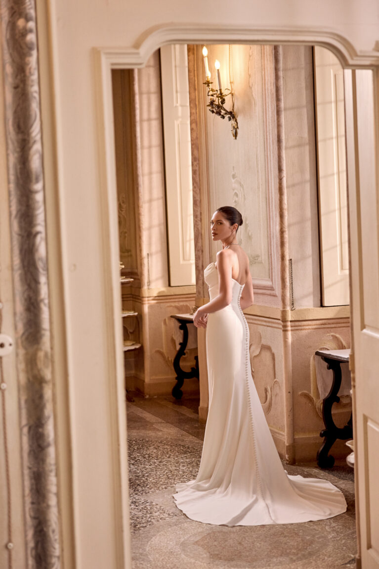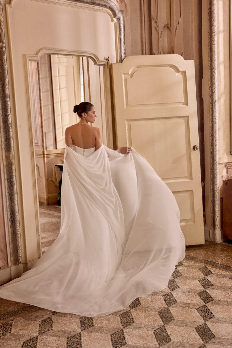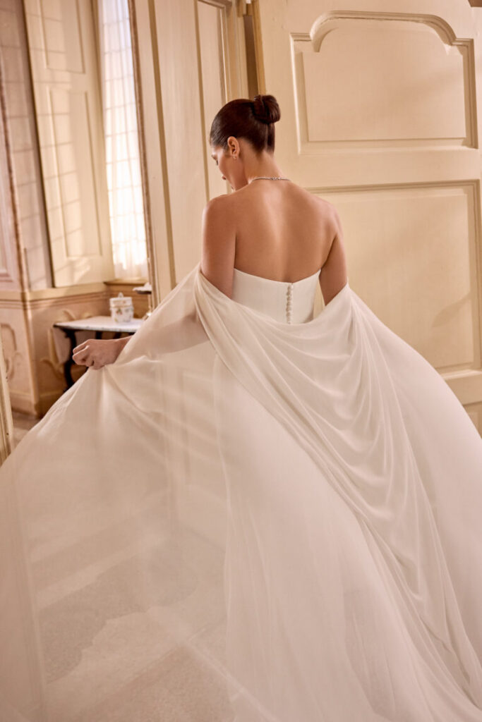 Justin Alexander Leti. This elegant clean crepe fit-and-flare gown features a modern strapless cat-eye neckline complemented by beautiful draping. Flattering ruching across the bodice seamlessly blends into soft draping on the top of the skirt. The back is finished with a line of buttons extending to the end of the chapel-length train. The matching cape is sold separately.