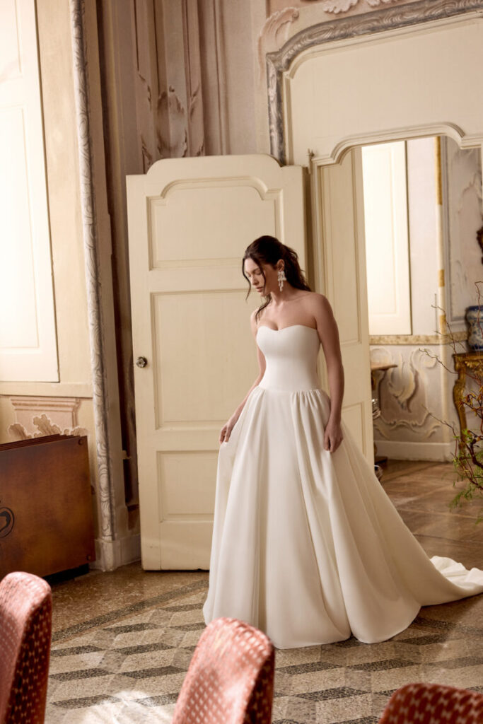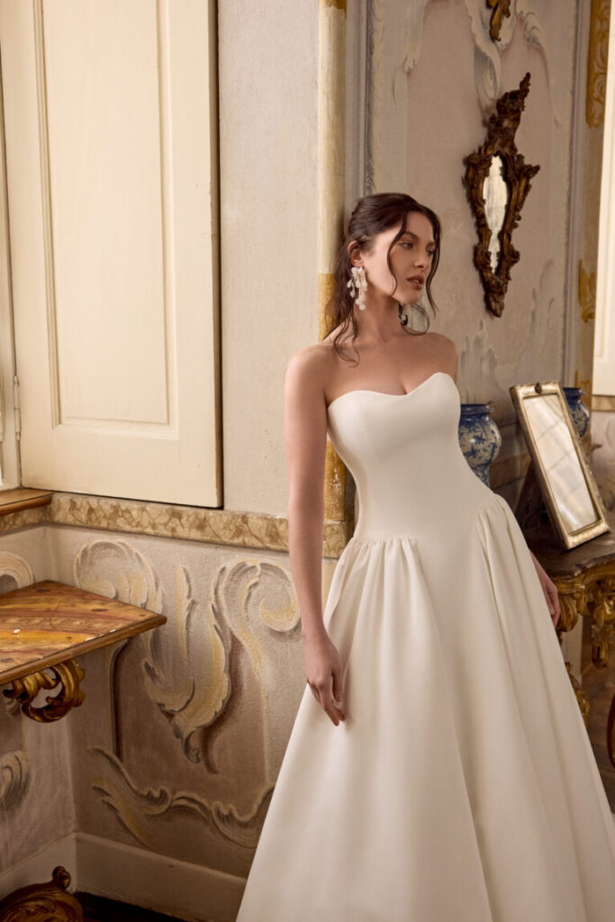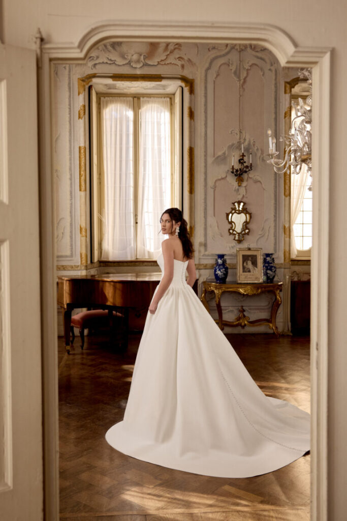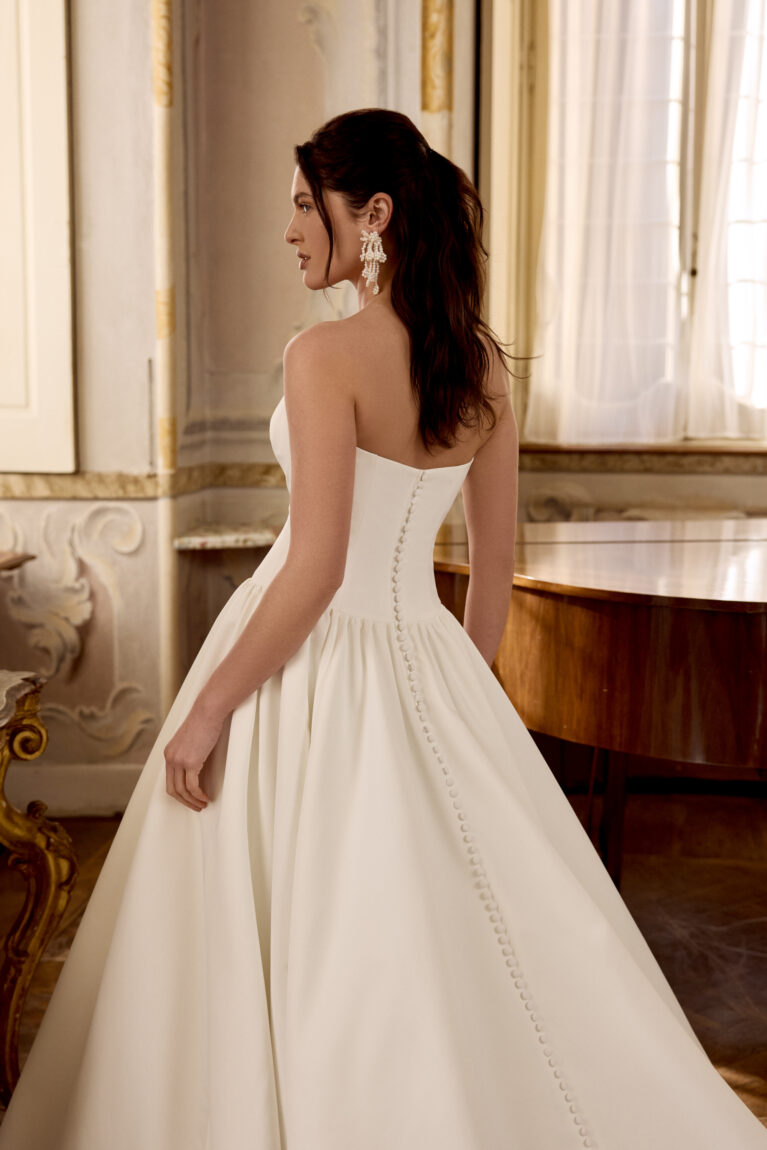 Justin Alexander London. This breathtaking clean satin A-Line gown offers a flattering and structured silhouette. It features a refined modified sweetheart neckline and elegant princess seams that shape the bodice. These seams transition into a sophisticated waterfall waistline, below which gathered detailing flows beautifully onto the front and back of the skirt. For a modern touch, the skirt includes convenient pockets. The back is finished with a stunning row of buttons that trail down the luxurious chapel-length train.