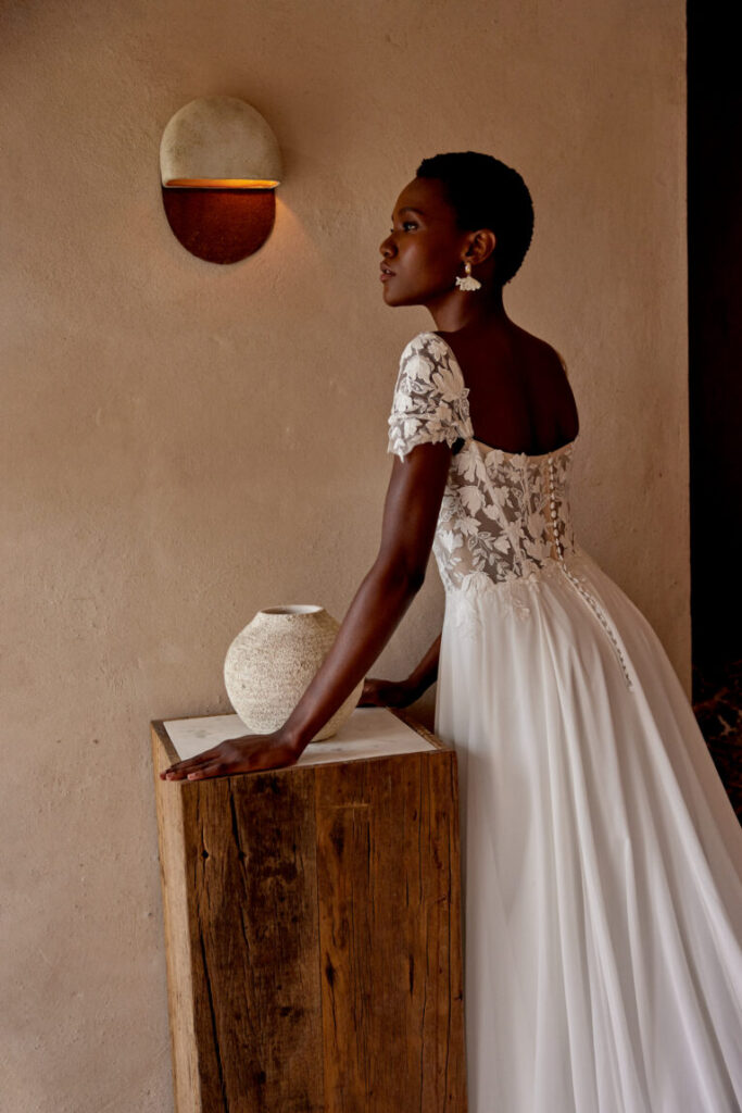 Chiffon A-line gown with straight neckline and detachable cap sleeves. Sheer bodice with exposed boning is adorned with matte floral lace appliques that end at waistline. Buttons to end of zipper. Chiffon skirt billows into a chapel length train with lace cutouts. Version with fully lined bodice available at no extra cost. Version without detailed train is also available.