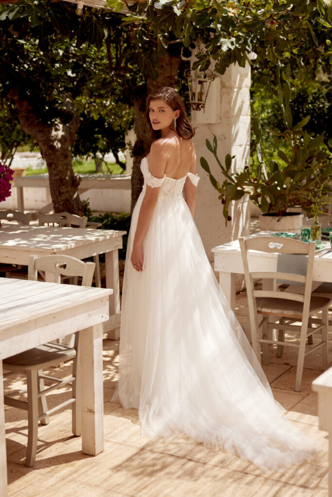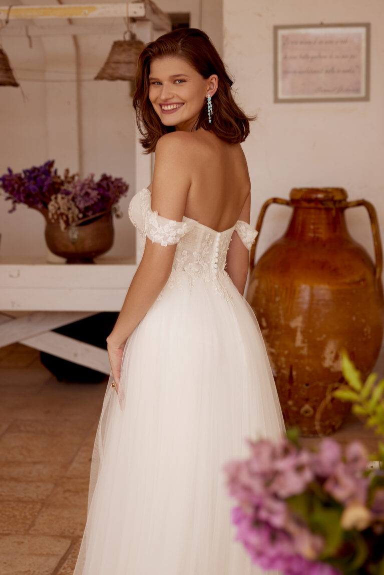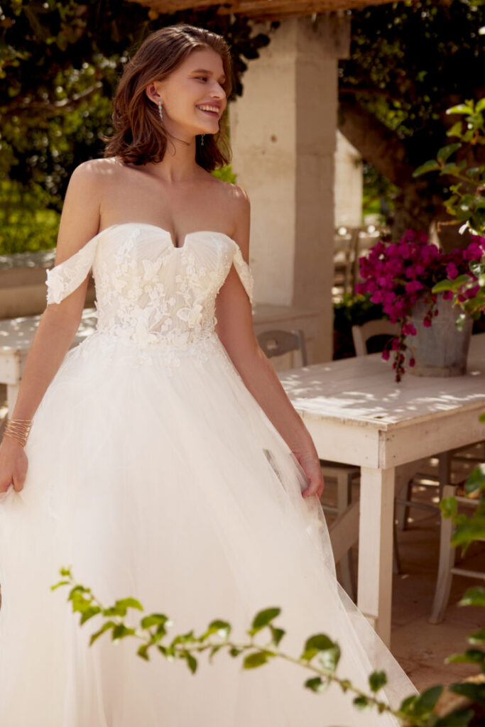 Style 66386 is an ethereal English net A-line gown featuring a romantic strapless notch neckline. The softly draped bodice is adorned with whimsical butterfly and floral beaded and pearl lace appliqués, lending an enchanting, nature-inspired charm. Detachable off-the-shoulder straps crafted in English net with matching appliqués offer versatile styling options. The lightweight skirt cascades effortlessly to a chapel-length ruffle hem train for graceful movement with every step. Also available with a fully lined bodice.