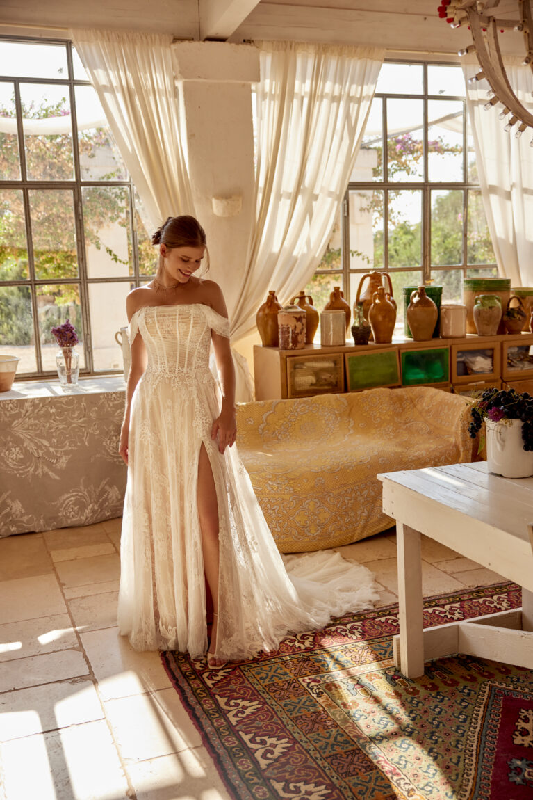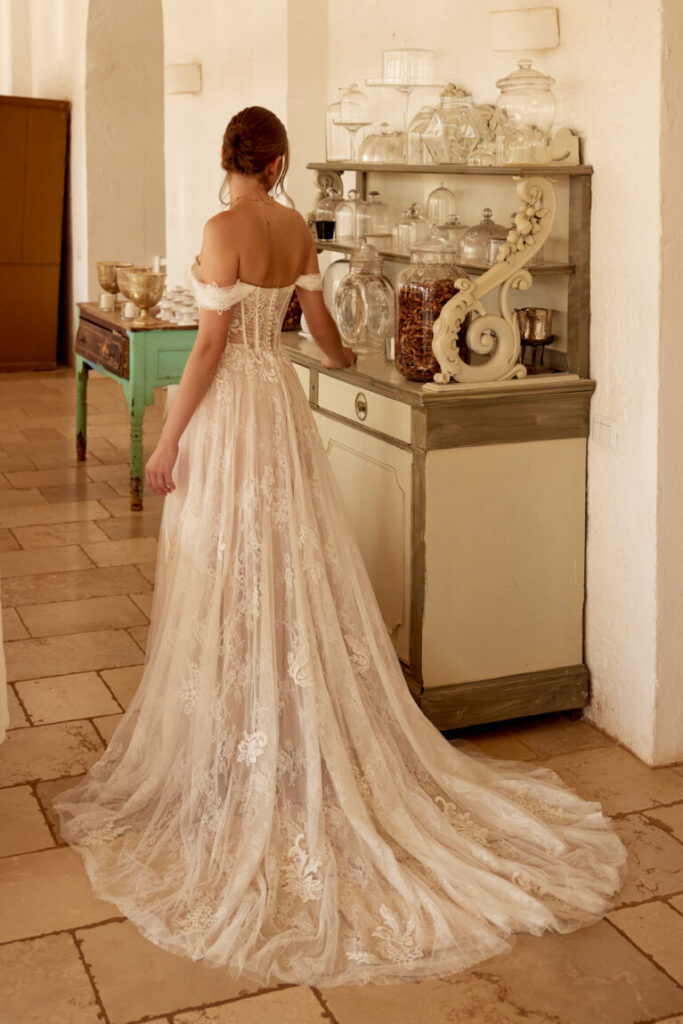Style 66395 is a chantilly lace A-Line strapless gown with detachable off-the-shoulder straps. The sheer bodice is beautifully draped with tulle and adorned with delicate matte lace appliques that cascade from the waist down to the chapel-length train. Classic covered buttons accentuate the back detail, while a strategic skirt slit adds movement and elegance to this sophisticated design. Also available with fully lined bodice or without skirt slit at no extra cost.