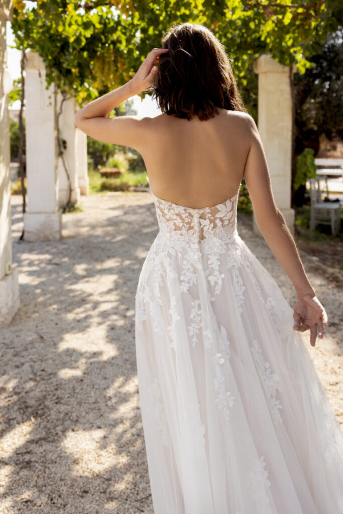 Style 66405 is an ethereal tulle A-line gown featuring a trendy halter neckline. The sheer bodice is adorned with matte cotton lace appliqués that trickle gracefully from the waist into the skirt, flowing to the end of the chapel-length train. The sheer back bodice is finished with delicate tulle-covered buttons extending to the waist. Also available with a fully lined bodice and straps.