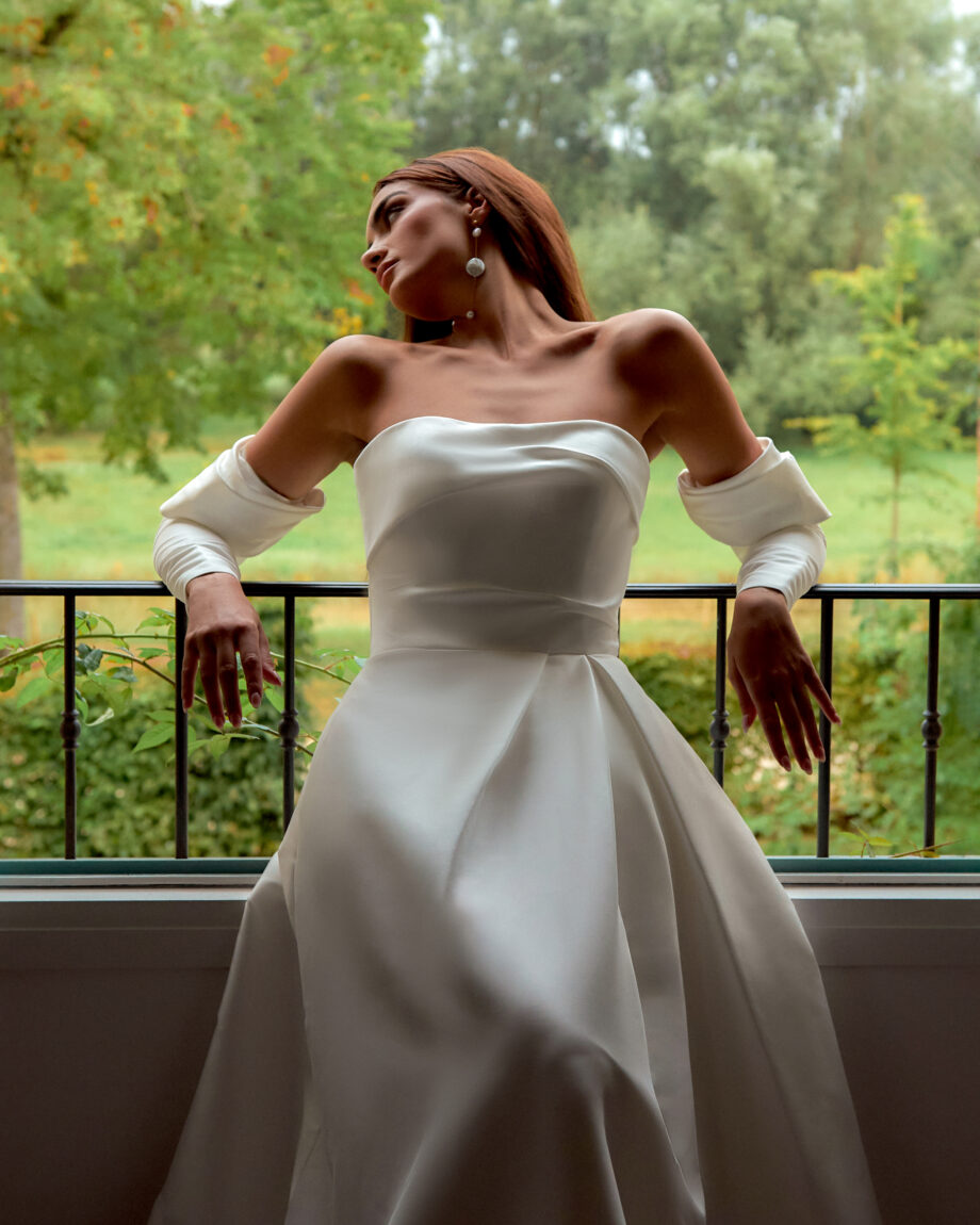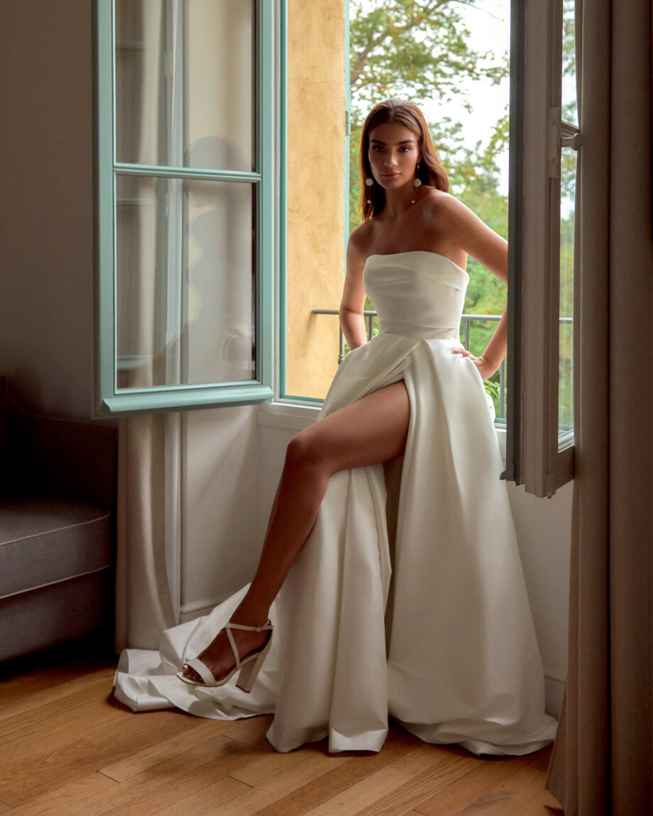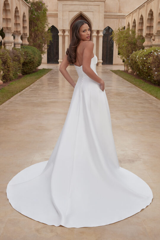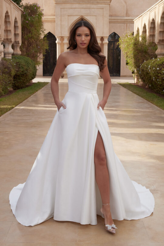Style 44416 is a strapless stretch Mikado A-line wedding dress with draped straight neckline. Pleated skirt leads to a slit. Finished with Mikado covered buttons down back and a chapel length train. This dress can be paired with long sleeves. Version without skirt slit is not available.