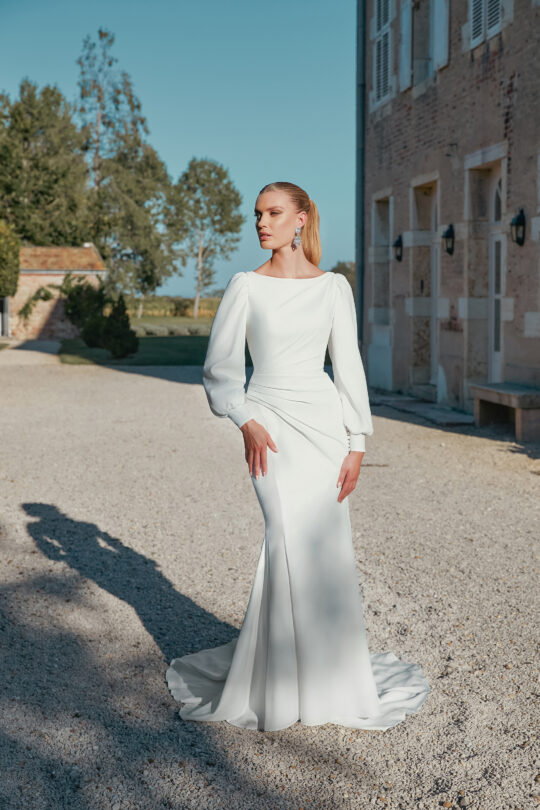 Style 44450 with Sleeves is a stretch crepe fit and flare with a high boat neckline, long detachable sleeves and a V-back. Ruching accents bodice and continues down skirt leading to a slit. Gown finished with crepe covered buttons down back to start of chapel length train. The dress is also available without sleeves. A version without skirt slit ia also available.
