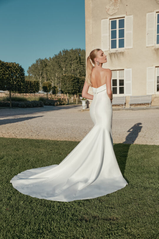 Style 44456 is a strapless stretch Mikado fit and flare dress with straight neckline detailed with a cuff. It features jersey lining and Mikado covered buttons extending to end of sweep length train.