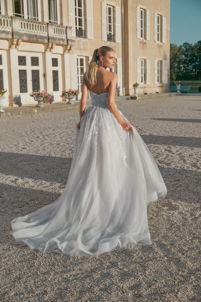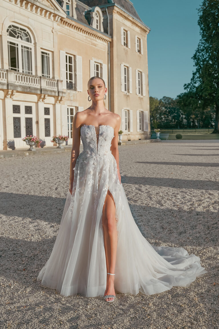 Style 44472 is a strapless A-line gown featuring a lined bodice and a notch neckline, embellished with allover sequined lace appliqués accented by silver embroidery. Delicate 3D flowers with pearl and beaded insets are scattered throughout, adding a touch of romance. A slit and a horsehair hem on the second layer complete the skirt, while Mikado-covered buttons trail down the back bodice to a chapel-length train. A version without the skirt slit is available.