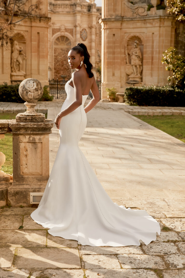 Style 44496 is a satin mermaid gown with a strapless sweetheart neckline featuring princess seams down the front of the bodice. Sleek silhouette with full mermaid skirt including side godets and seams down the back of the bodice and skirt.