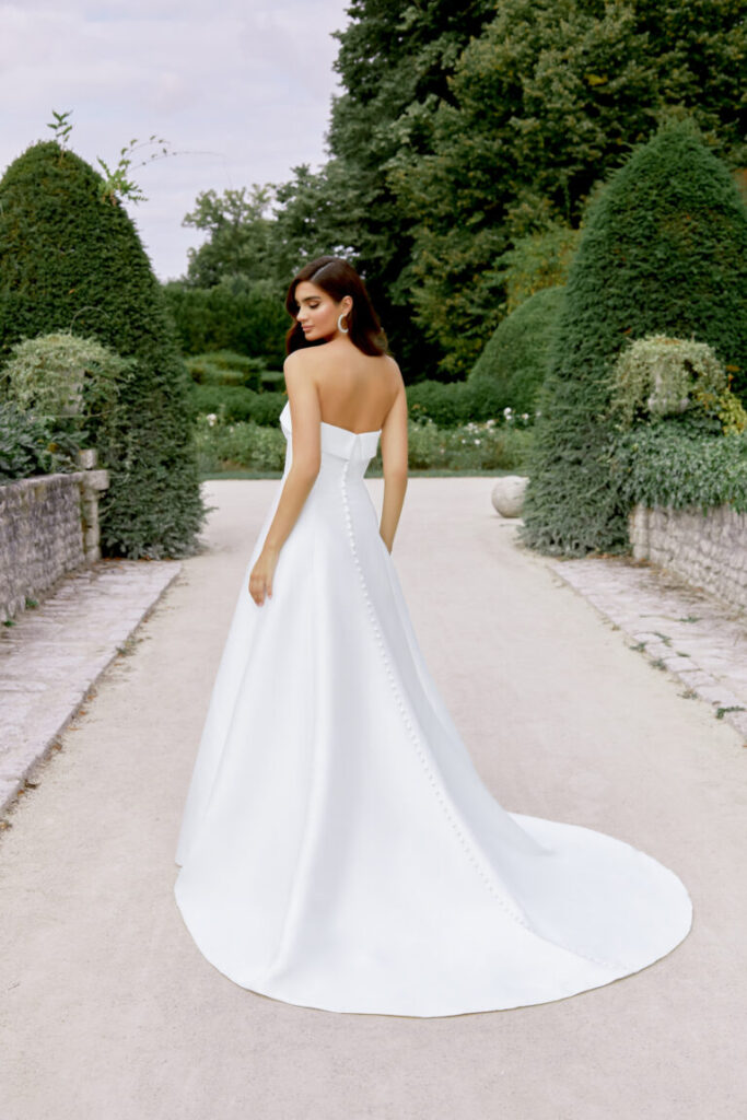 Style 44511 is a sleek Mikado A-line gown crowned by a modern strapless cuff neckline. Sculpting princess seams trace the front, giving the silhouette an elongated, figure-flattering line, while a row of covered buttons streams from the back neckline to the edge of the chapel-length train for a timeless, refined finish.