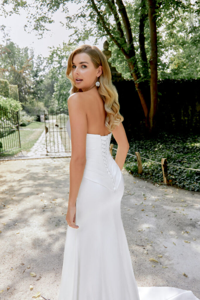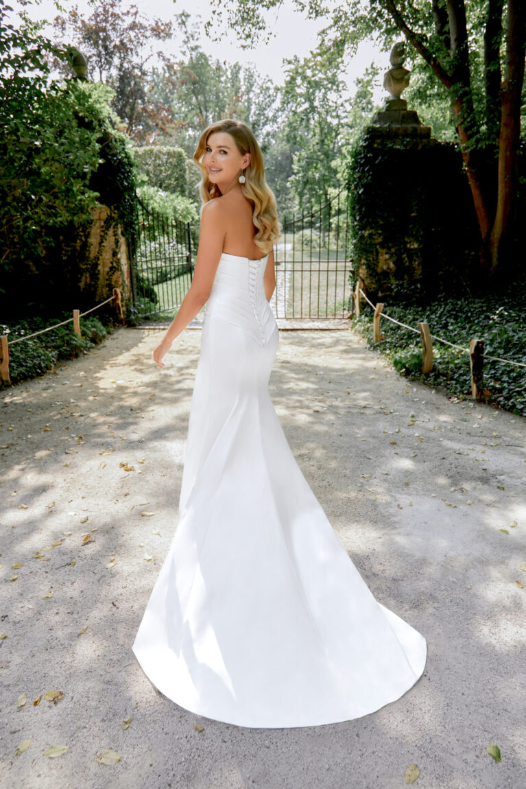 Style 44518 is a sculpted fit-and-flare gown cut from fluid charmeuse, crowned by a pointed sweetheart neckline. Flattering, all-over ruching and diagonal pleats contour every curve, while a lace-up back adds adjustable support and a touch of romance. The silhouette releases into a sweeping chapel-length train, and an alternate version offers a smooth zipper closure for those who prefer a sleeker finish.