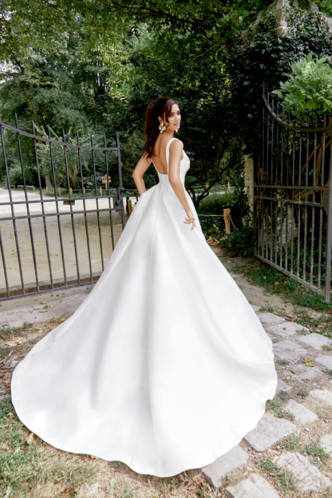 Style 44521 is a dramatic full A-line gown sculpted from luminous Mikado and crowned by a refined Sabrina neckline. Soft, figure-flattering ruching sweeps across the bodice, cinched by a crisp inset waistband that highlights the waist. A modern square back is finished with a trail of covered buttons that tumble gracefully to the edge of the chapel-length train, completing this timelessly elegant silhouette.