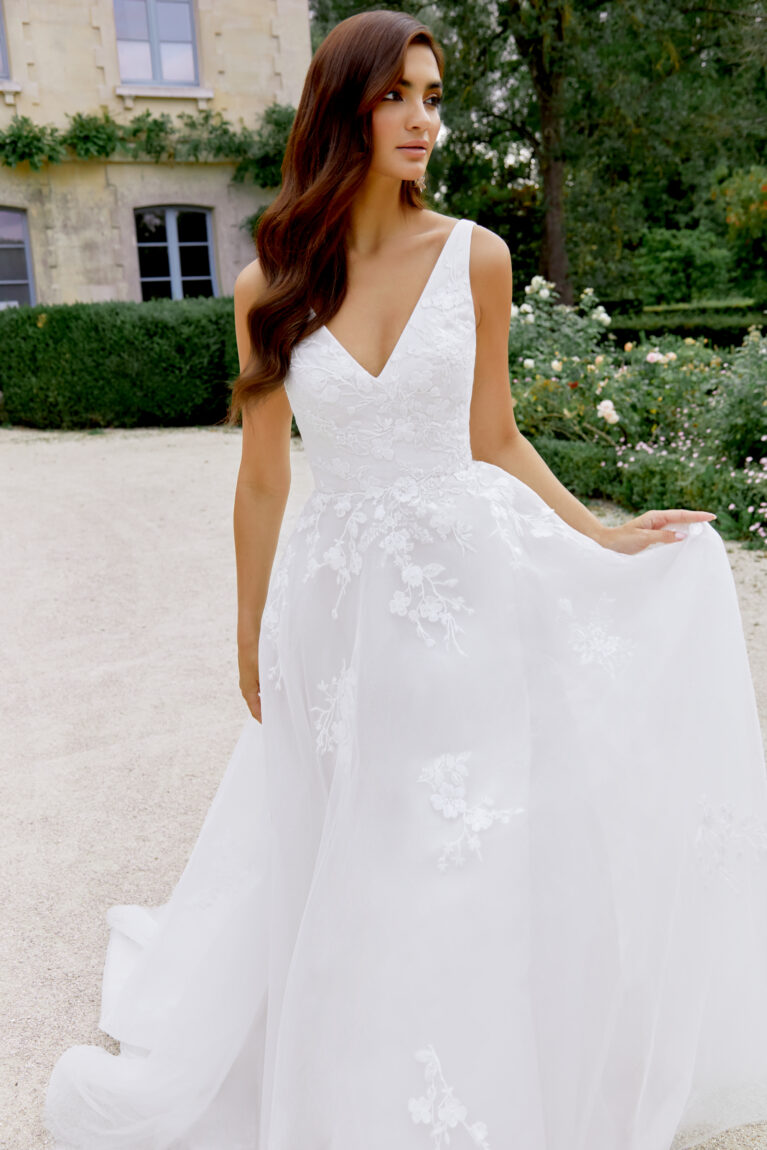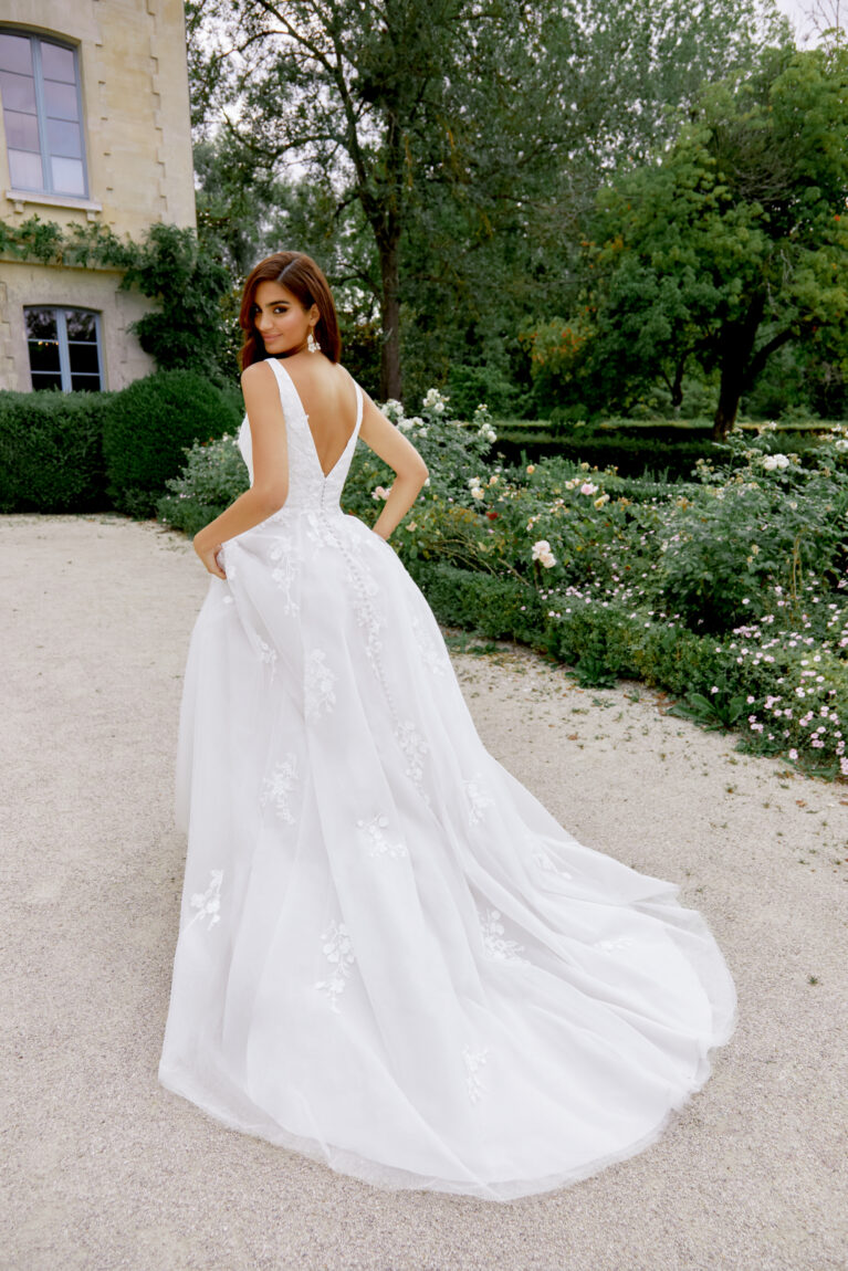 Style 44525 is a romantic A-line gown crafted in ethereal sparkle tulle, featuring an elegant V-neckline. The fully lined bodice is artfully layered with shimmering sparkle tulle and sequined lace appliqués that cascade gracefully from the waist into the flowing skirt. The back mirrors the front with a flattering V-shape, while delicate tulle-covered buttons trail from the bodice to the hem of the sweeping chapel-length train. Also available in a non-sparkle tulle version for a more understated look.